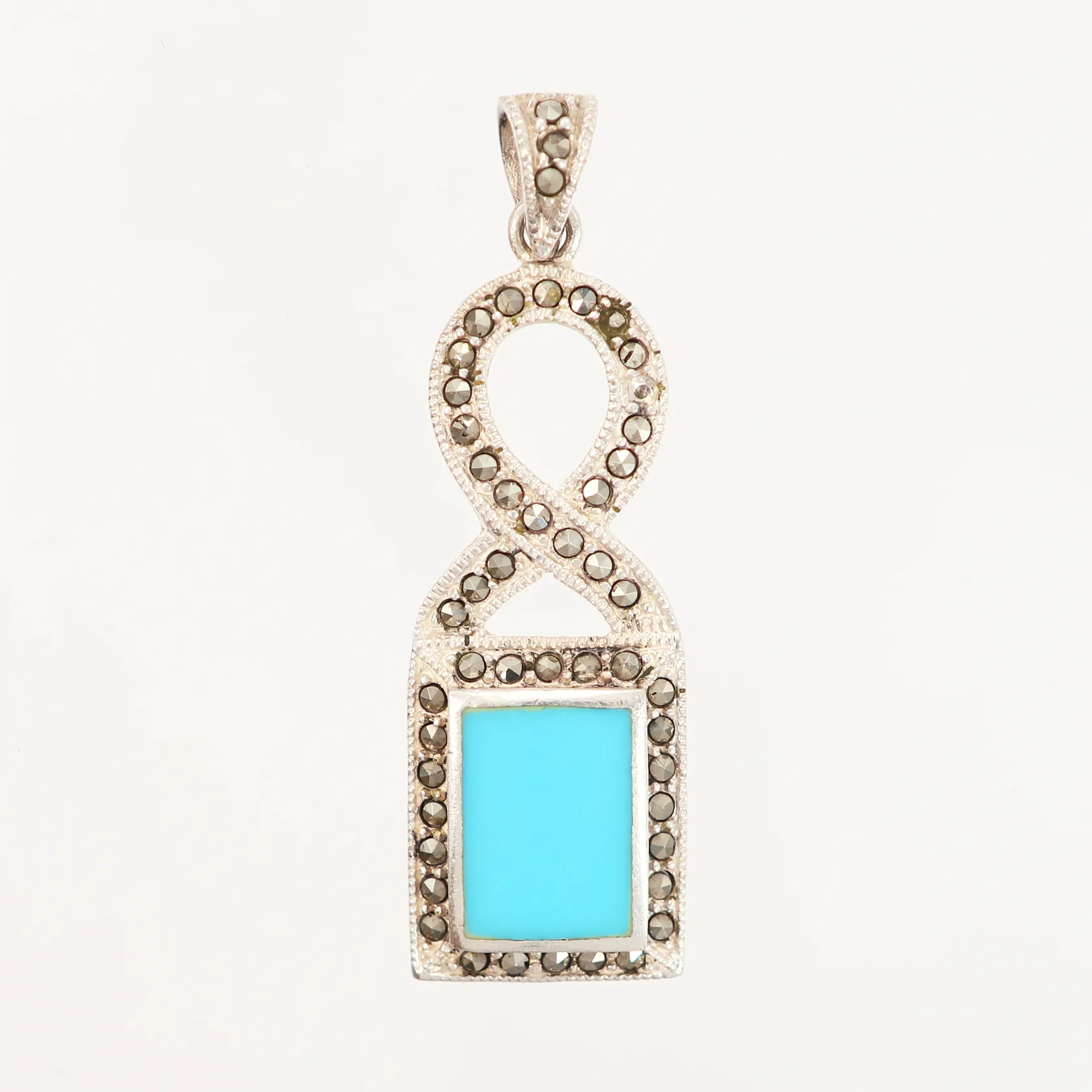 Hänge med markasiter, turkos emalj, höjd 50mm, bredd:15mm, en sten saknas, 925/1000 Silver. Vikt: 6,8 g.