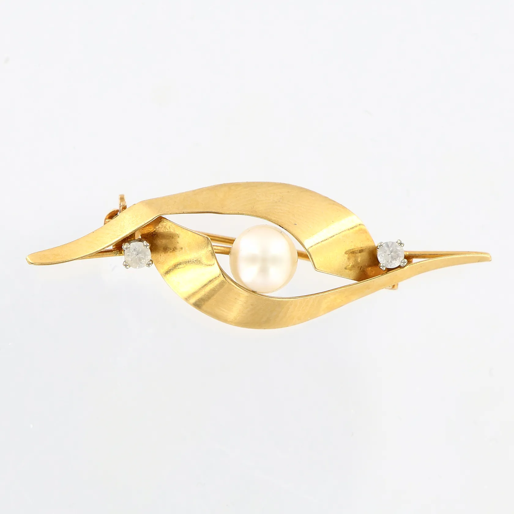 Brosch pärla Ø6mm vita stenar, 45x15mm, 18K. Vikt: 2,9 g.