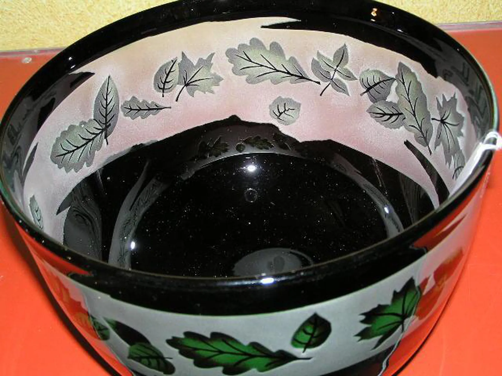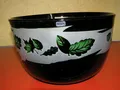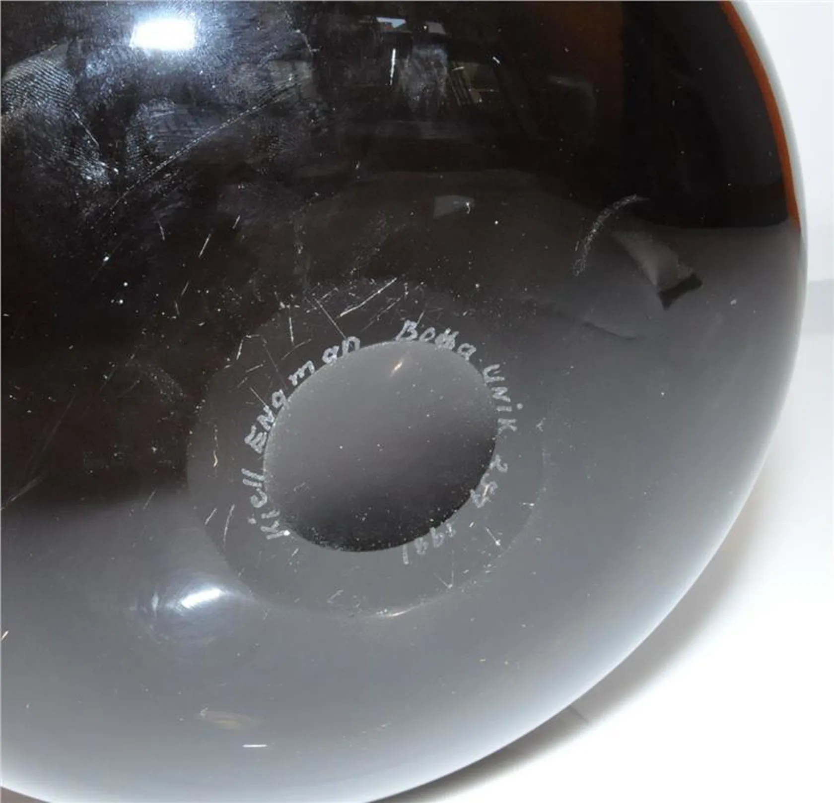 1 vacker bålskål av Kjell Engman Kosta Boda signerad: "Kjell Engman Boda Unik 257 1981". Färgen är mörkbrun/olivgrön, höjd 16 cm, övre Ø 25,5 cm. Vackert utskurna löv på insidan mot frostat glas. Vikt 3.300 gram. Obs 1 liten defekt på insidan i, form av en rund inbuktning i botten av skålens insida (från tillverkningen), se bild 4 under lampreflexen. Frakt 400 kr DHL