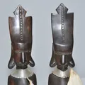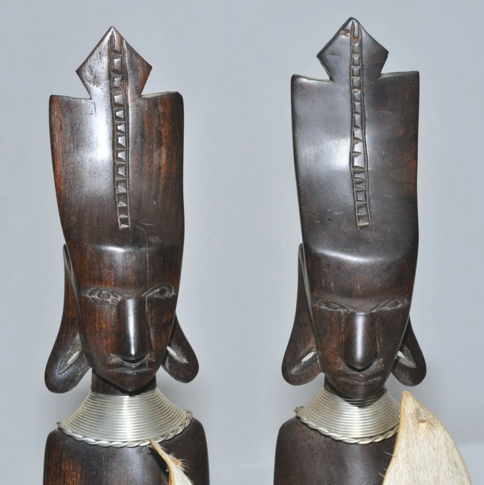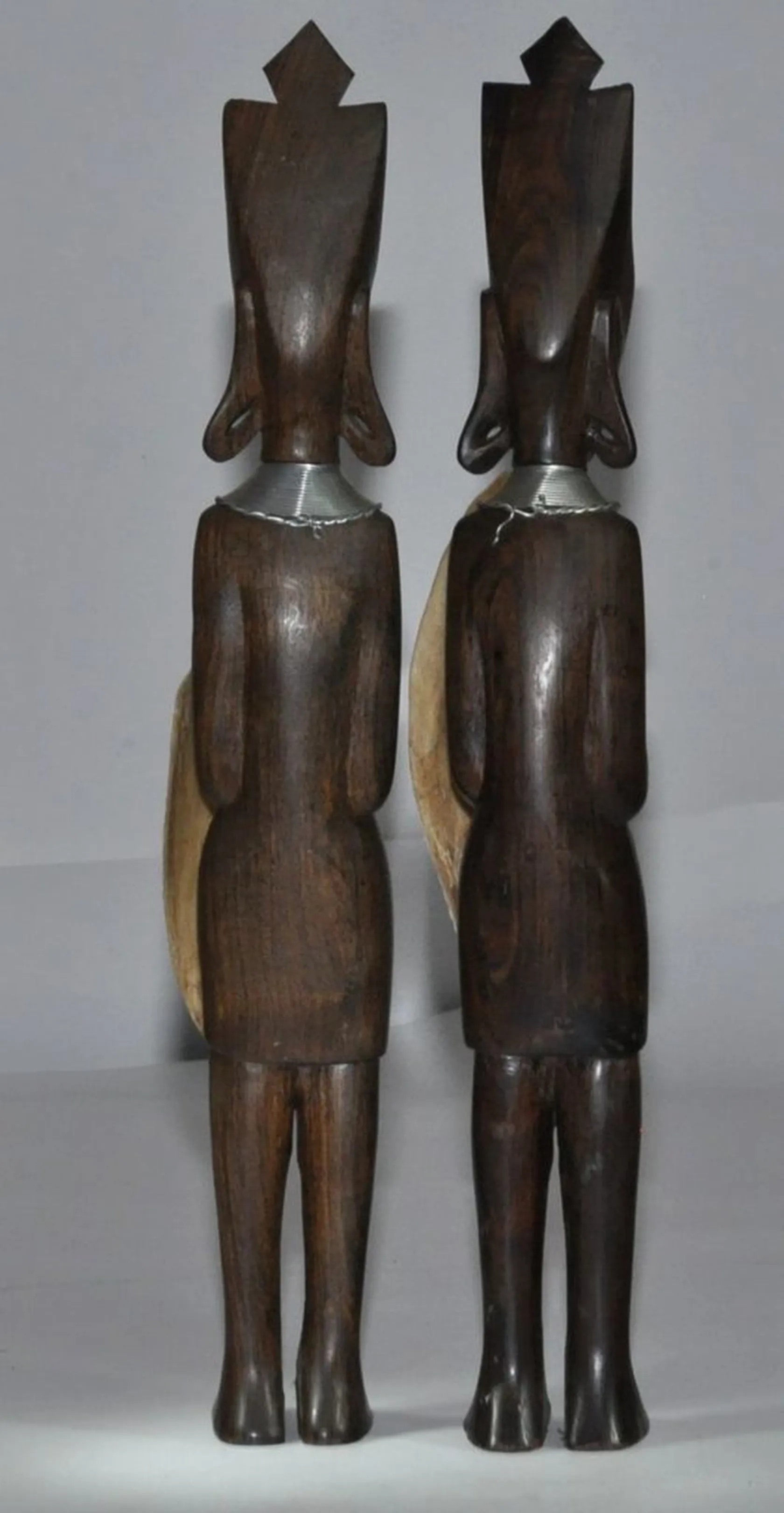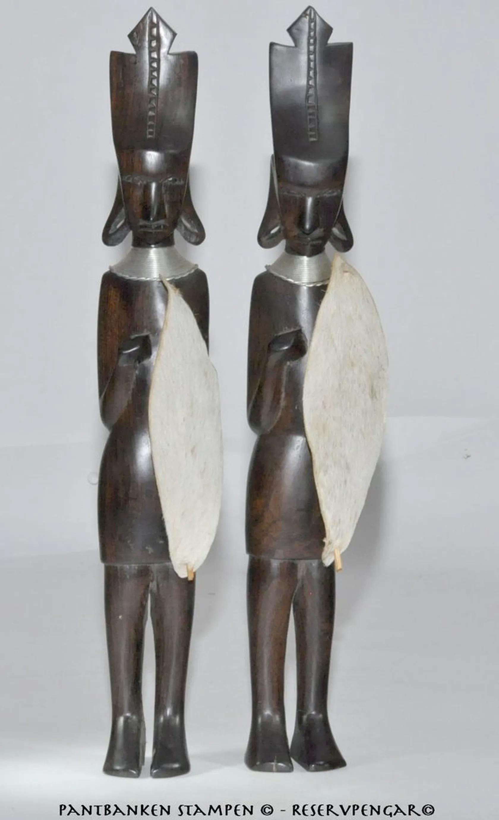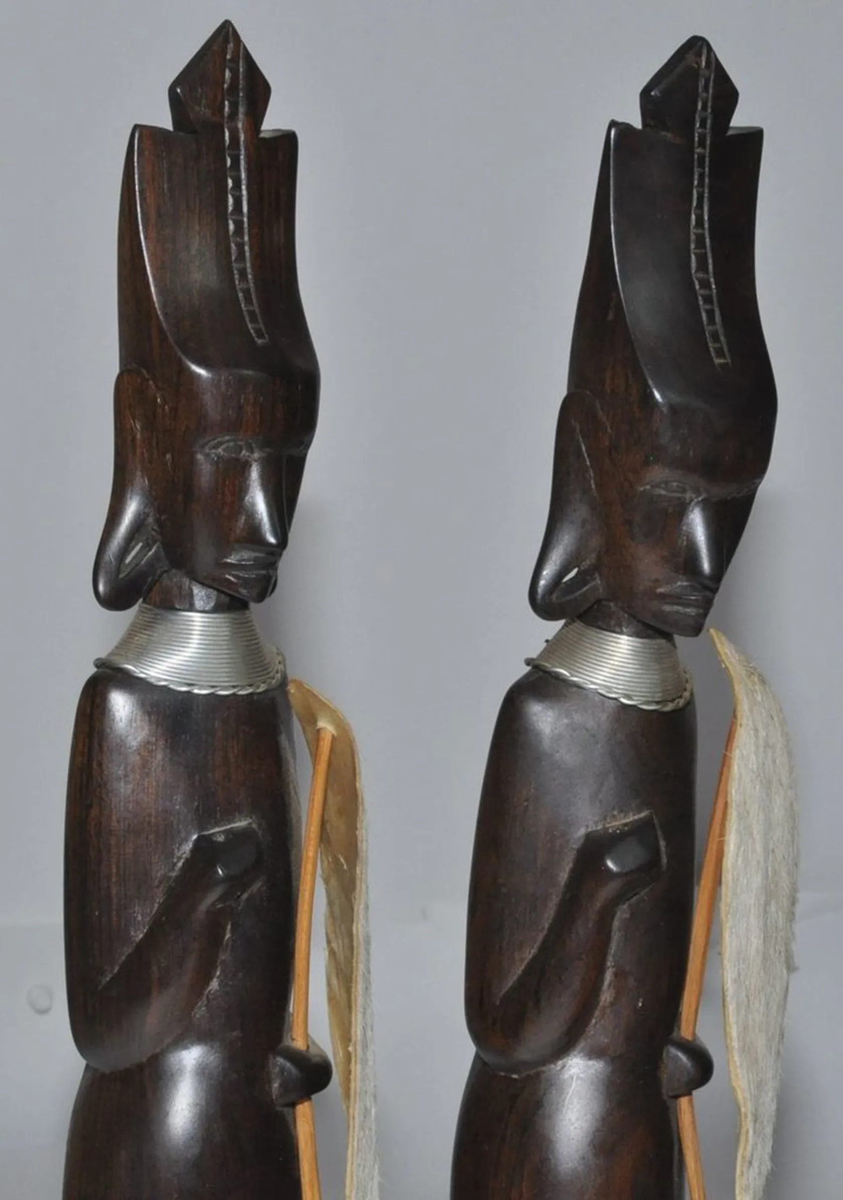 2 Massajer träskulpturer i massivt ädelträ spjut saknas sköld av torkat skinn H 36 cm 1 liten spricka på enafoten Fint skick iövrigt! . FRAKT 200 kr DHL