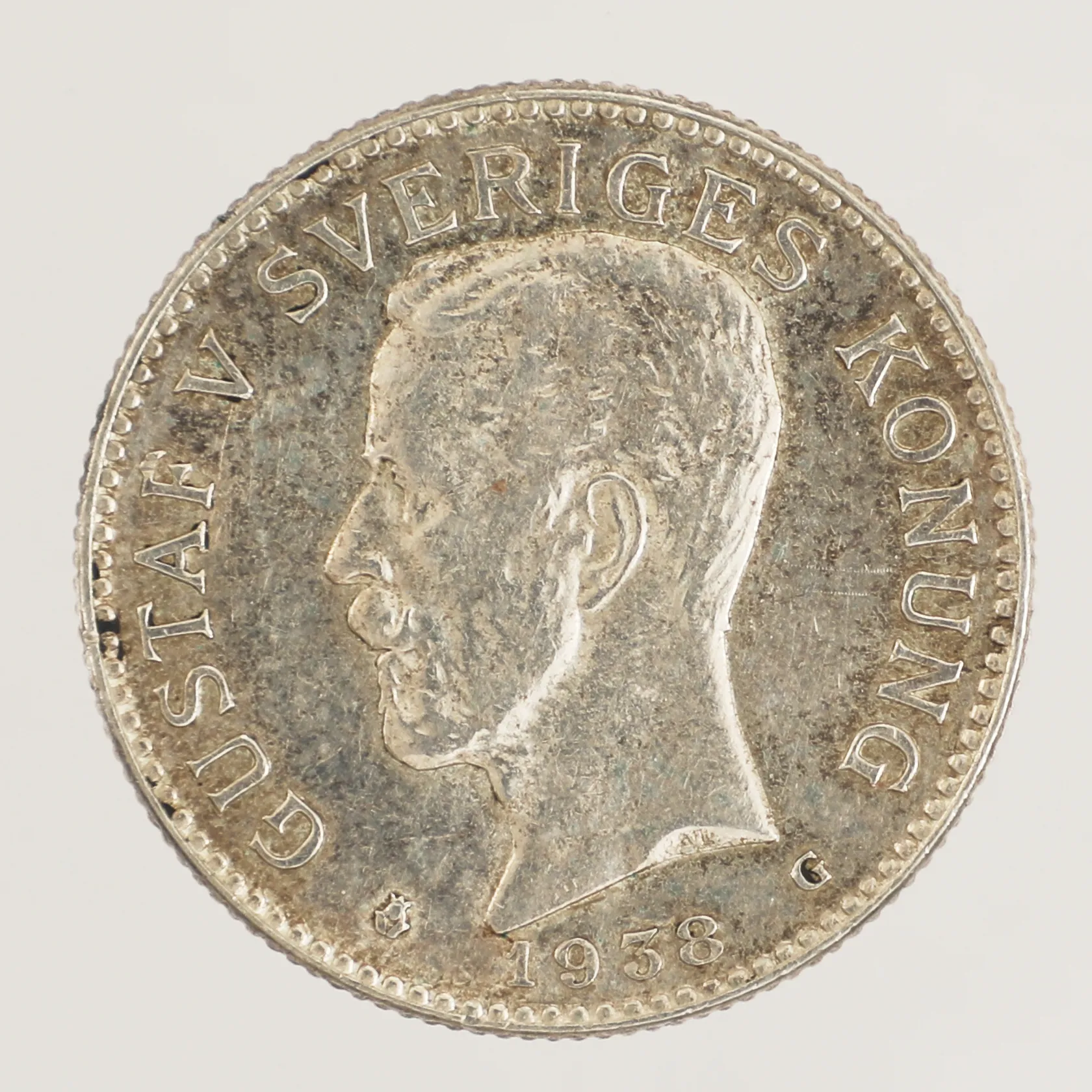 Mynt 2kr, Gustav V Sveriges Konung, Med folket för fosterlandet, 1939, Ø31mm, 800/1000 Vikt: 15 g.
