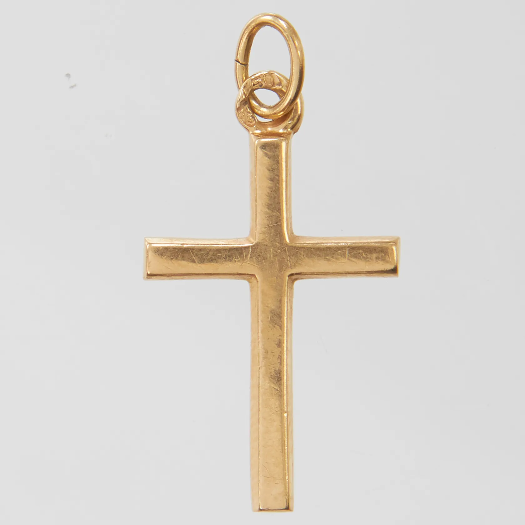 Hänge kors, längd ca 24mm inkl ögla, bredd 2-12mm, repig, 18K Vikt: 0,5 g.