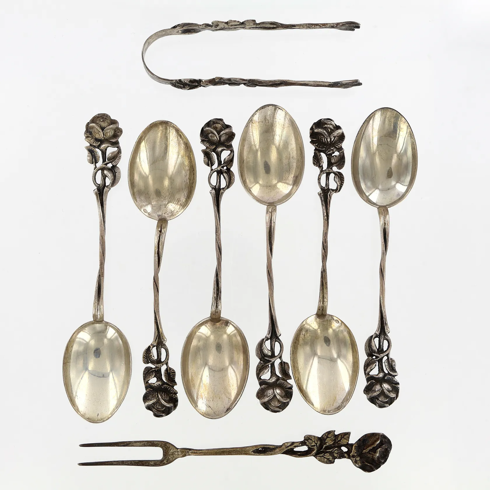 8 delar Rosen, 6 kaffeskedar, 1 sockertång och 1 sillgaffel, ca 7,5-10cm, 830/1000 Silver Vikt: 76,3 g.