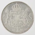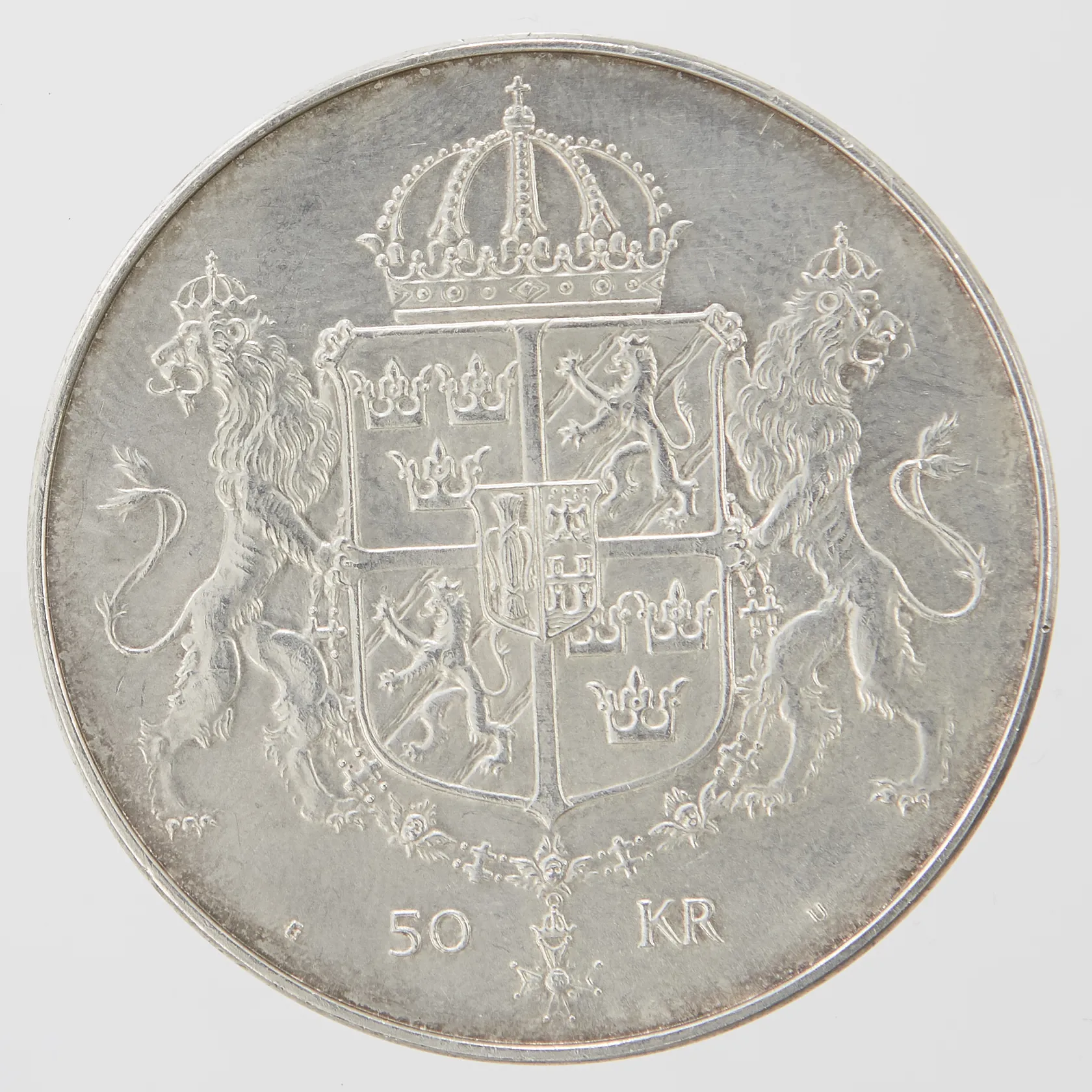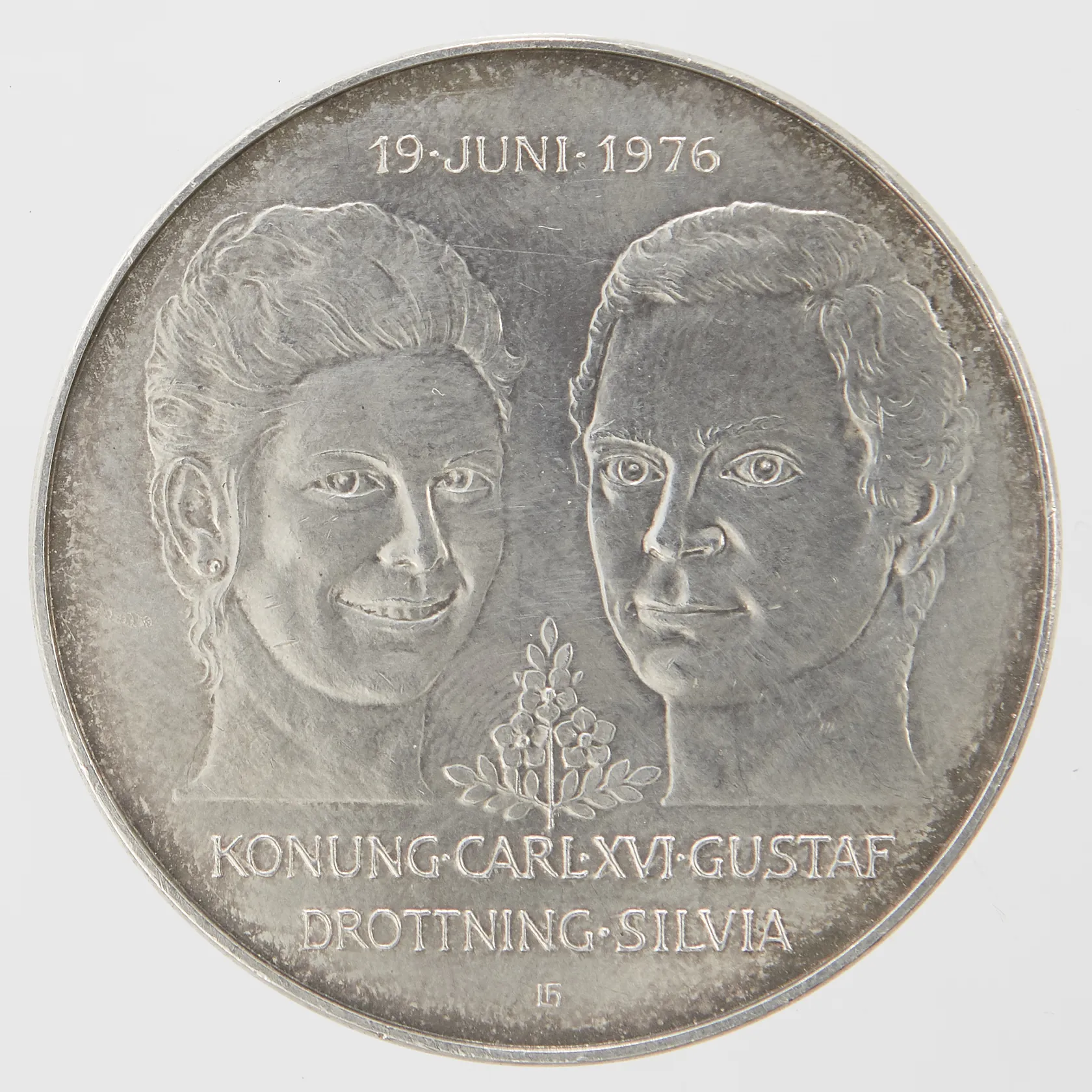 Minnesmynt Konung Carl XVI Gustaf och Drottning Silvia, 19 juni 1976, 50kr, Ø 36mm, repig, 925/1000 silver Vikt: 26,8 g.
