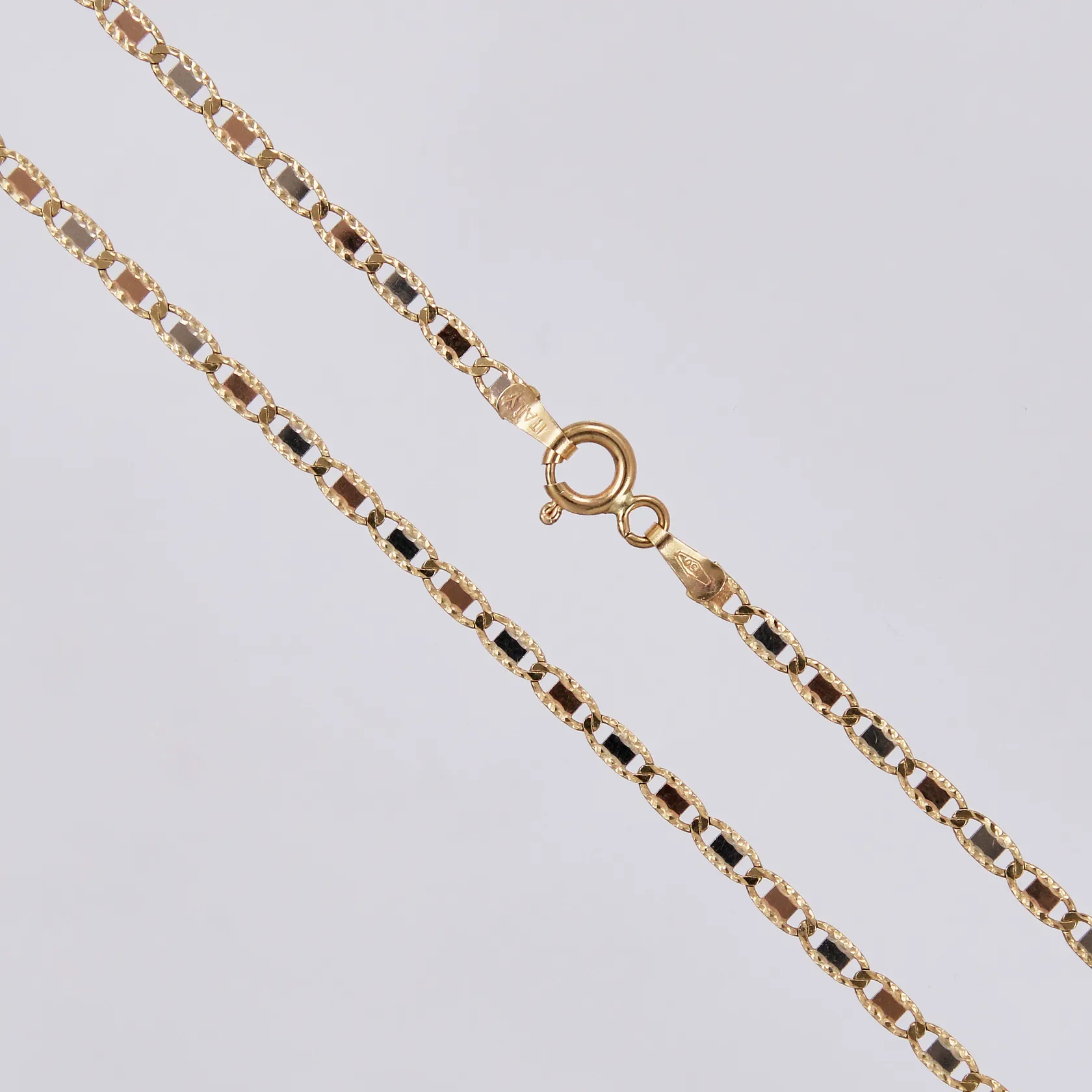 Kedja längd: ca 60cm bredd: ca 3mm guld/rött/vitt guld, 18K Vikt: 6,7 g.