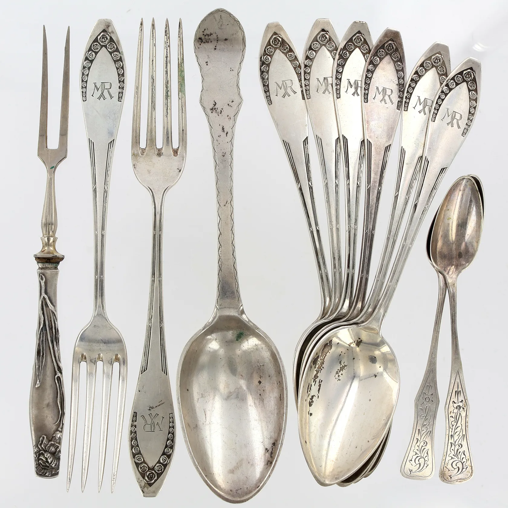 Diverse bestick, 2 gafflar, 6 skedar, 1 serveringsgaffel, 1 uppläggningsked, 2 teskedar, silver 800/1000 Vikt: 469,8 g.