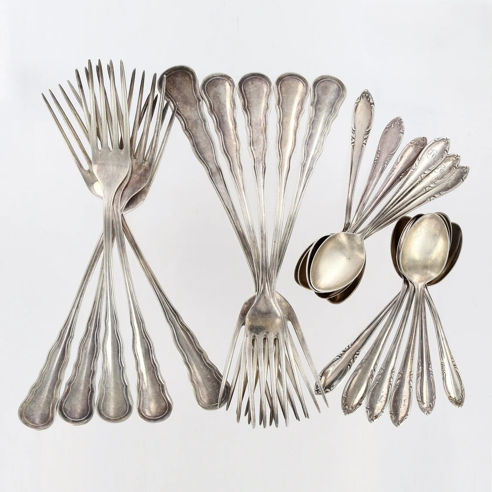 10 gafflar 19cm, 12 kaffeskedar 12cm, silver 830/1000 Vikt: 612,5 g.