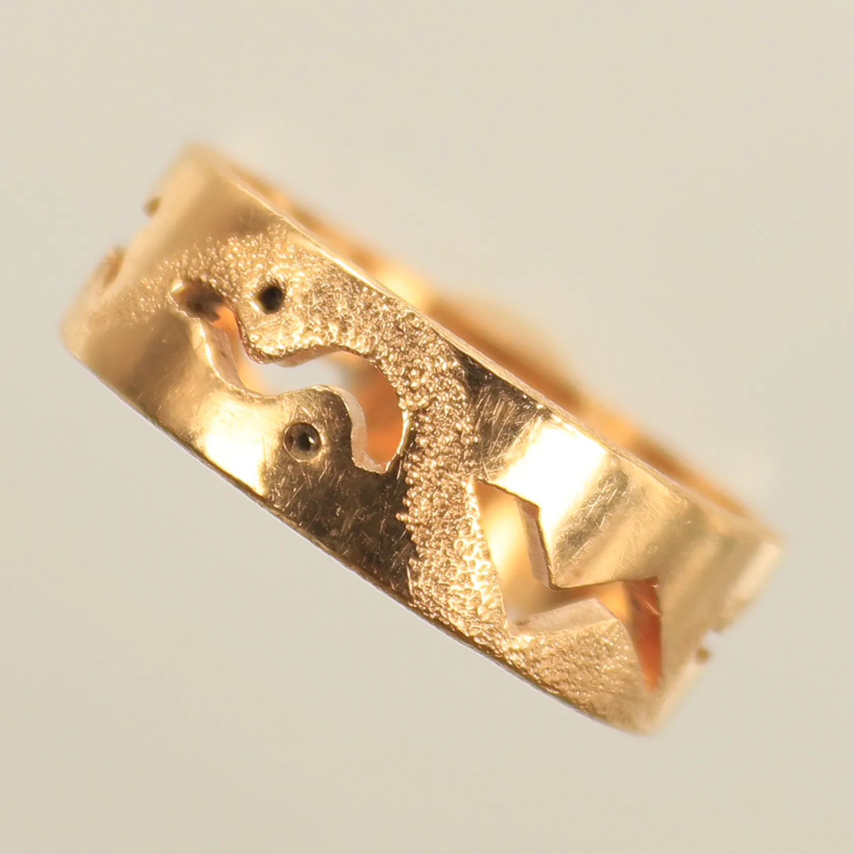 Ring med delvis hamrad yta och mönster, stl ca 19¼, bredd 7mm (något ojämn) 18K, 8,8g Vikt: 8,8 g.