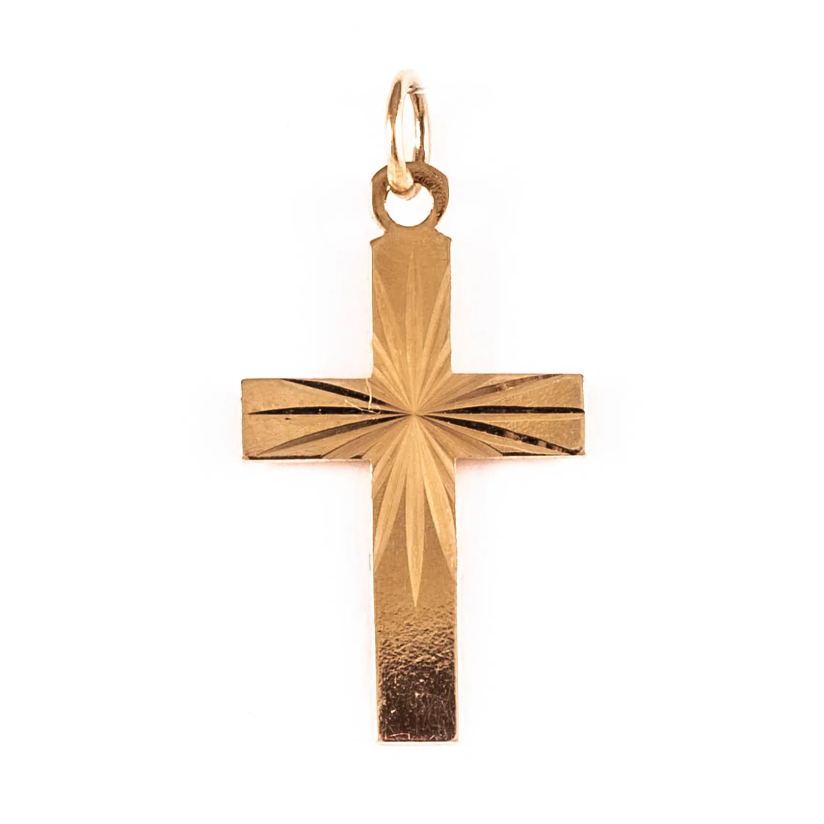 Hänge fasettslipat kors i 18K guld. Det är 12 mm brett, 23 mm långt inkl. ögla och väger 0,6g. Vikt: 0,6 g.
