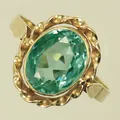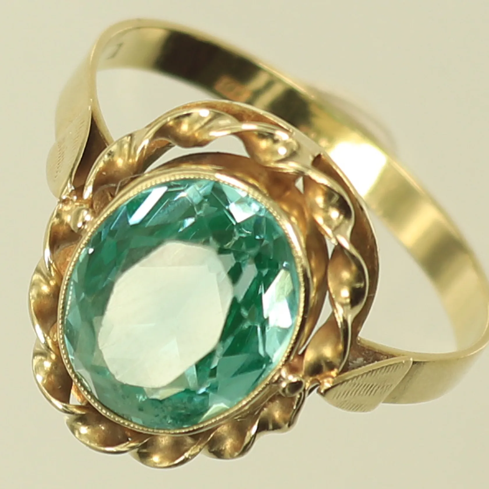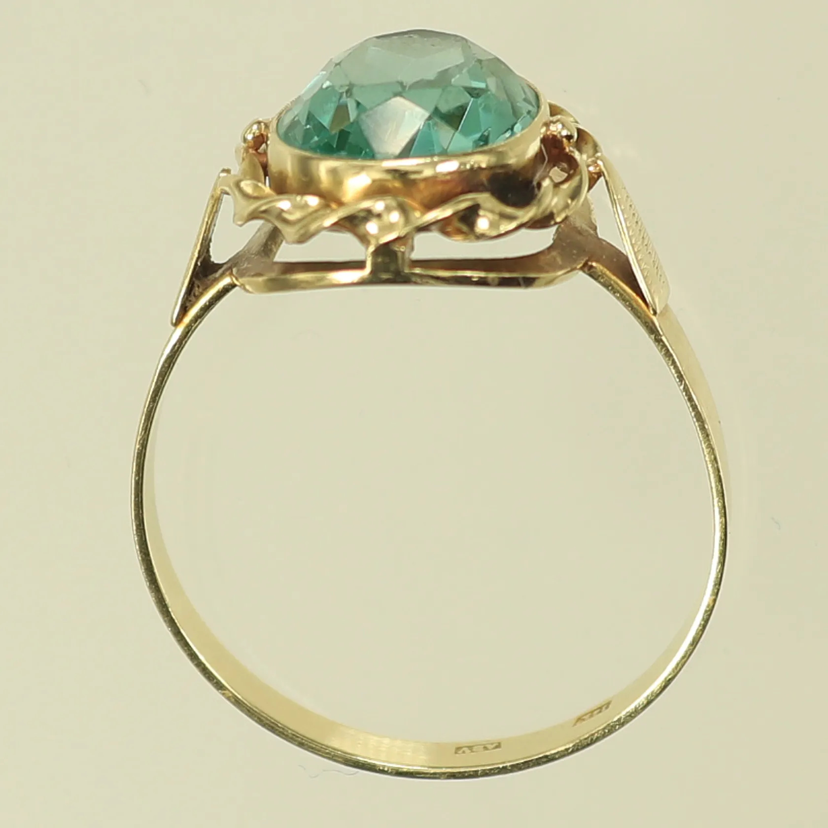 Ring med blågrön sten, stl stl 21¼, bredd 3-17mm, 14K, 4,4g bruttovikt, ca 3,5g guld Vikt: 4,4 g.