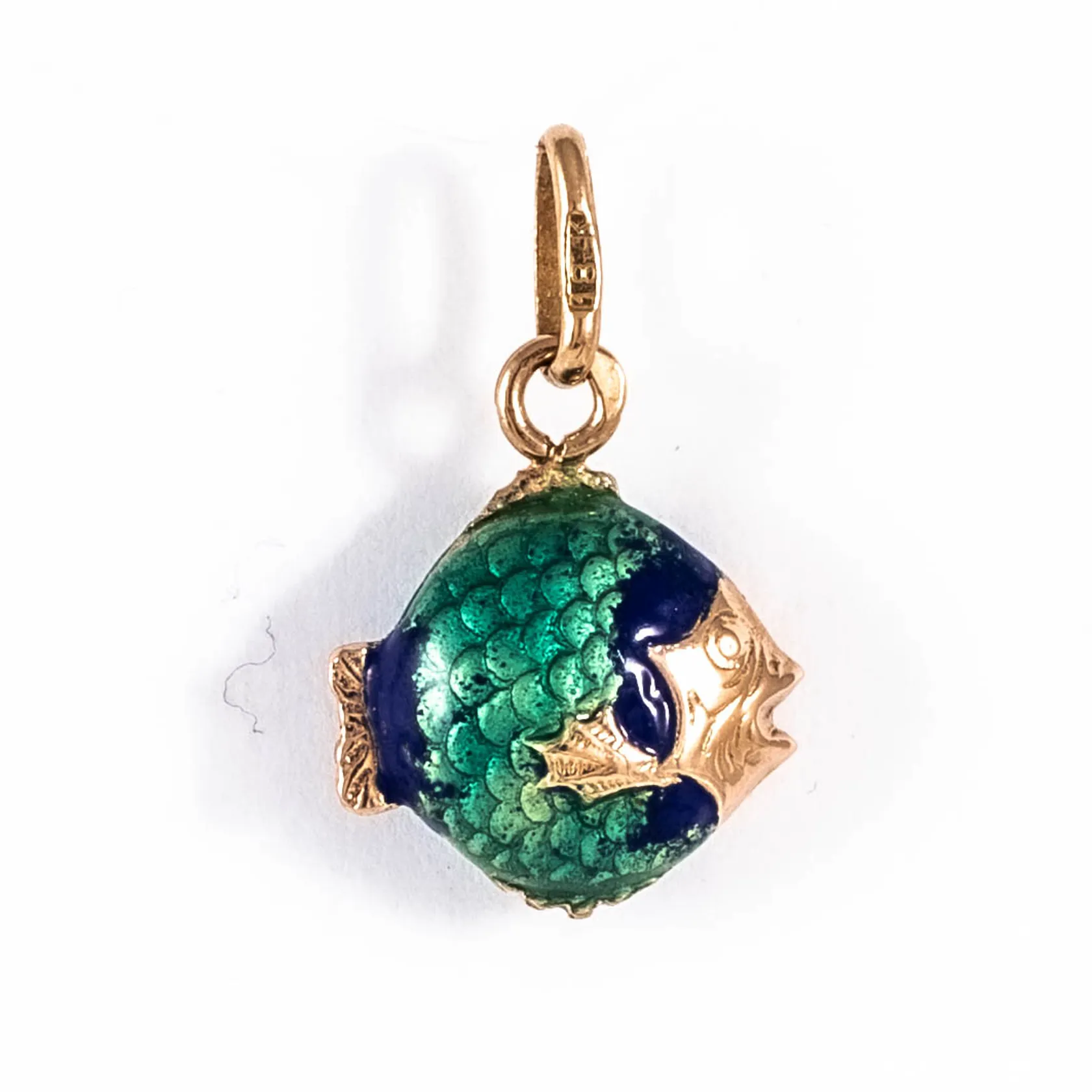 Hänge knubbig fisk med blågrön emalj i 18K guld. Den är 19,8 mm lång inkl ögla och väger 1,0g. Vikt: 1 g.