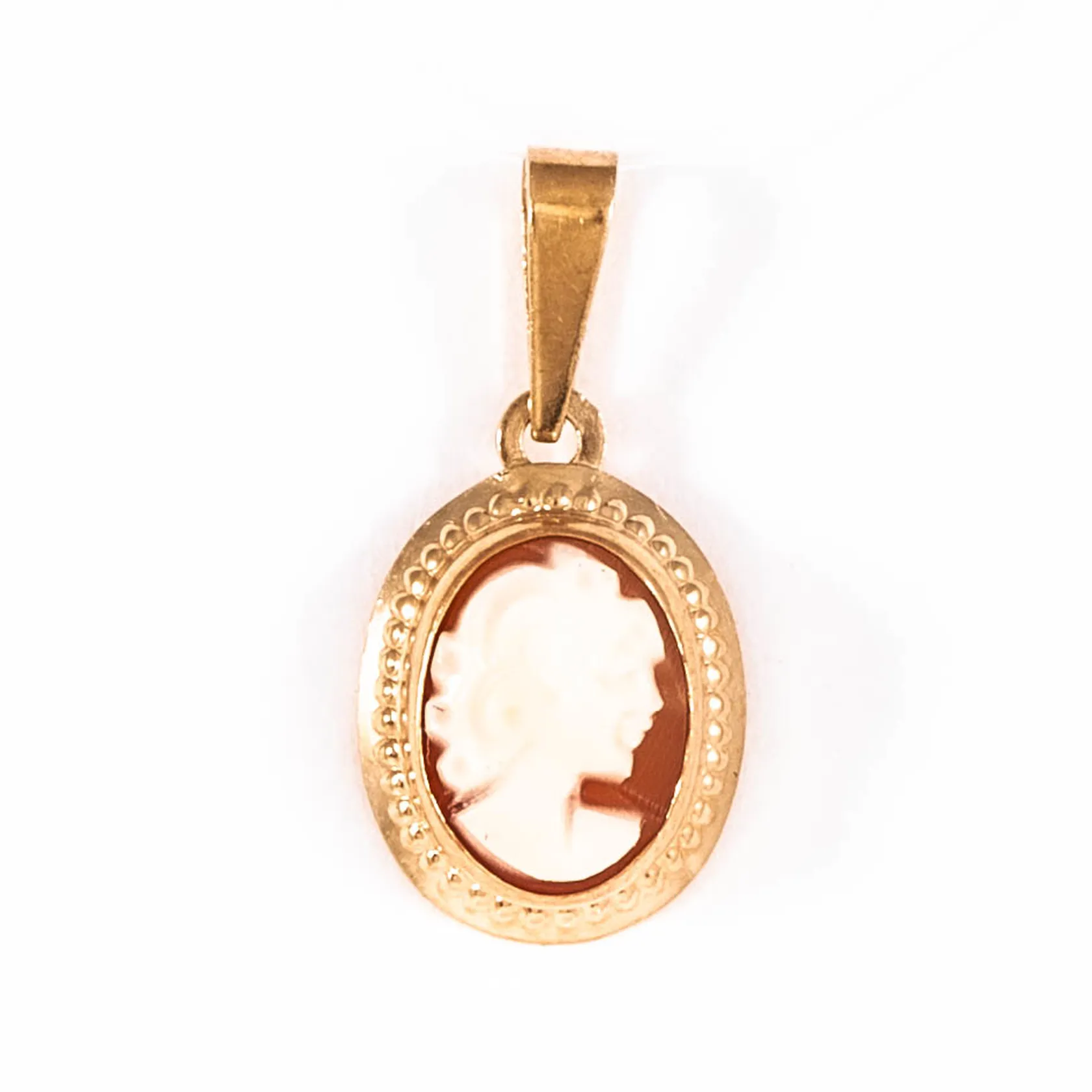 Hänge camé i 18K guld. Det är 17,4 mm långt inkl. ögla och väger 0,5g. Vikt: 0,5 g.