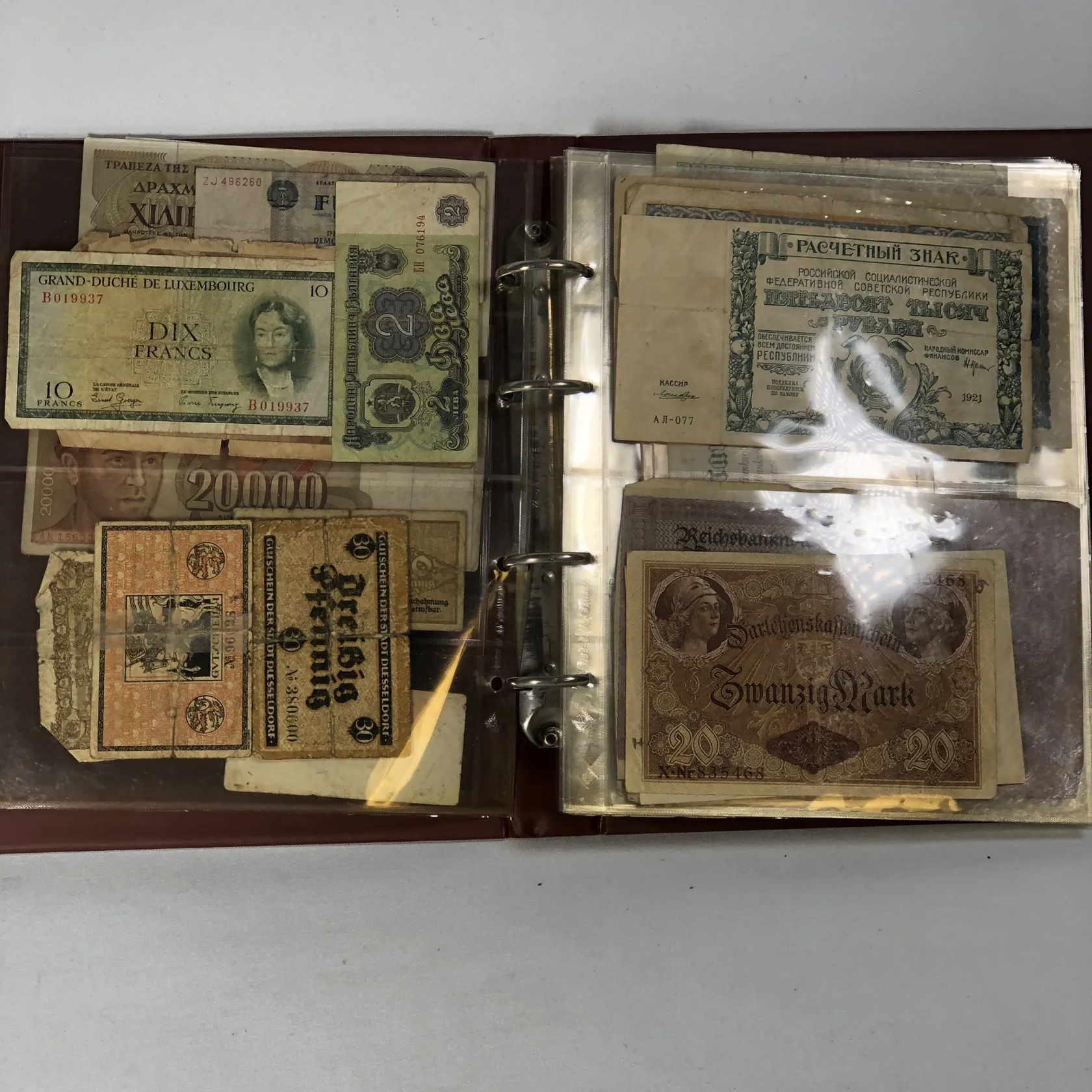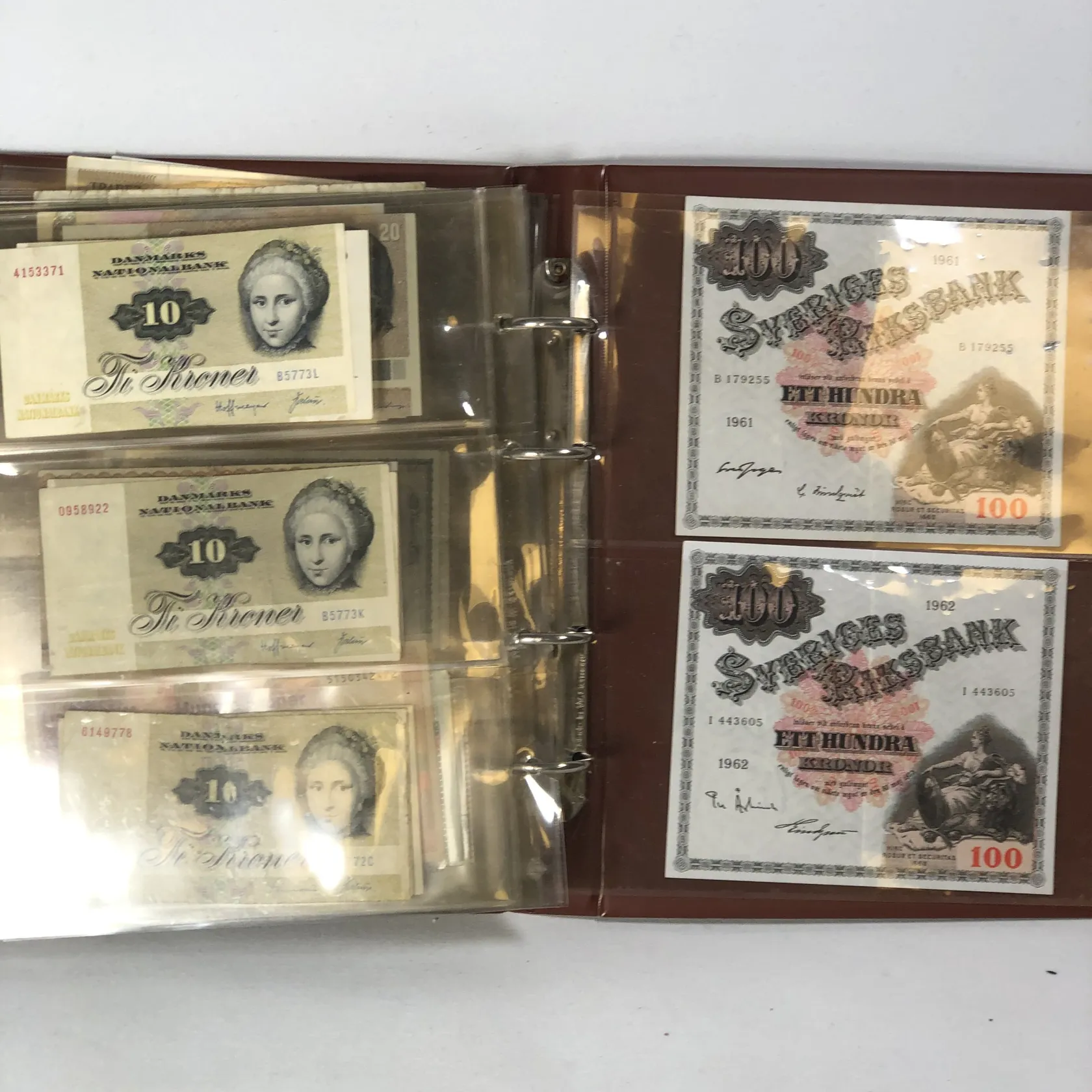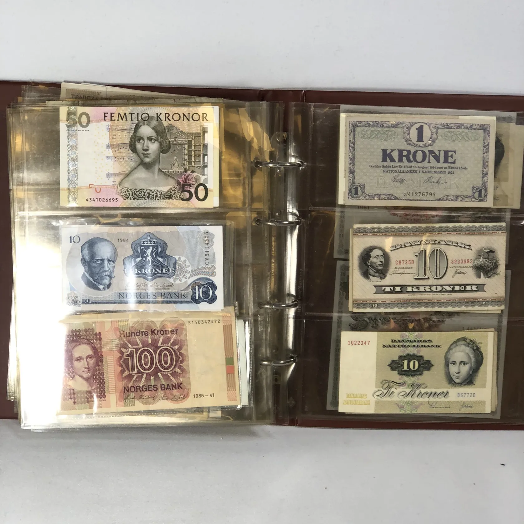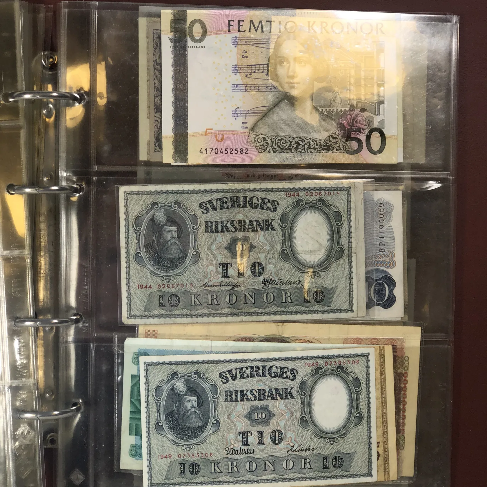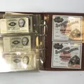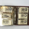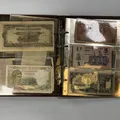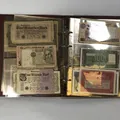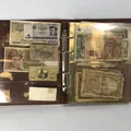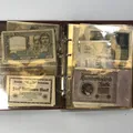 Album med sedlar av varierande ålder bl a Krigssedlar från första världskrigets Tyskland, Sovjetunionen 1921 Deutsche Reichsbahn 1923 5 och 10 miljoner mark samt 5 Miljarder mark svenska sedlar såsom 2 st 50 kronor med Jenny Lind (ocirkulerade) 2 st 100 kronor 1961 och 1962 2 st 10 kronor 1944 och 1949 totalt ca 50 st sedlar i varierande skick