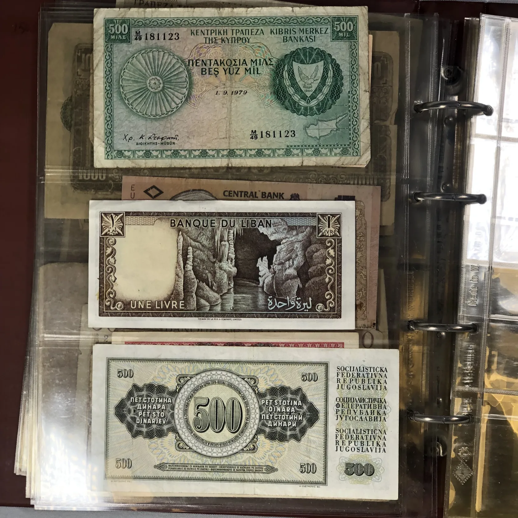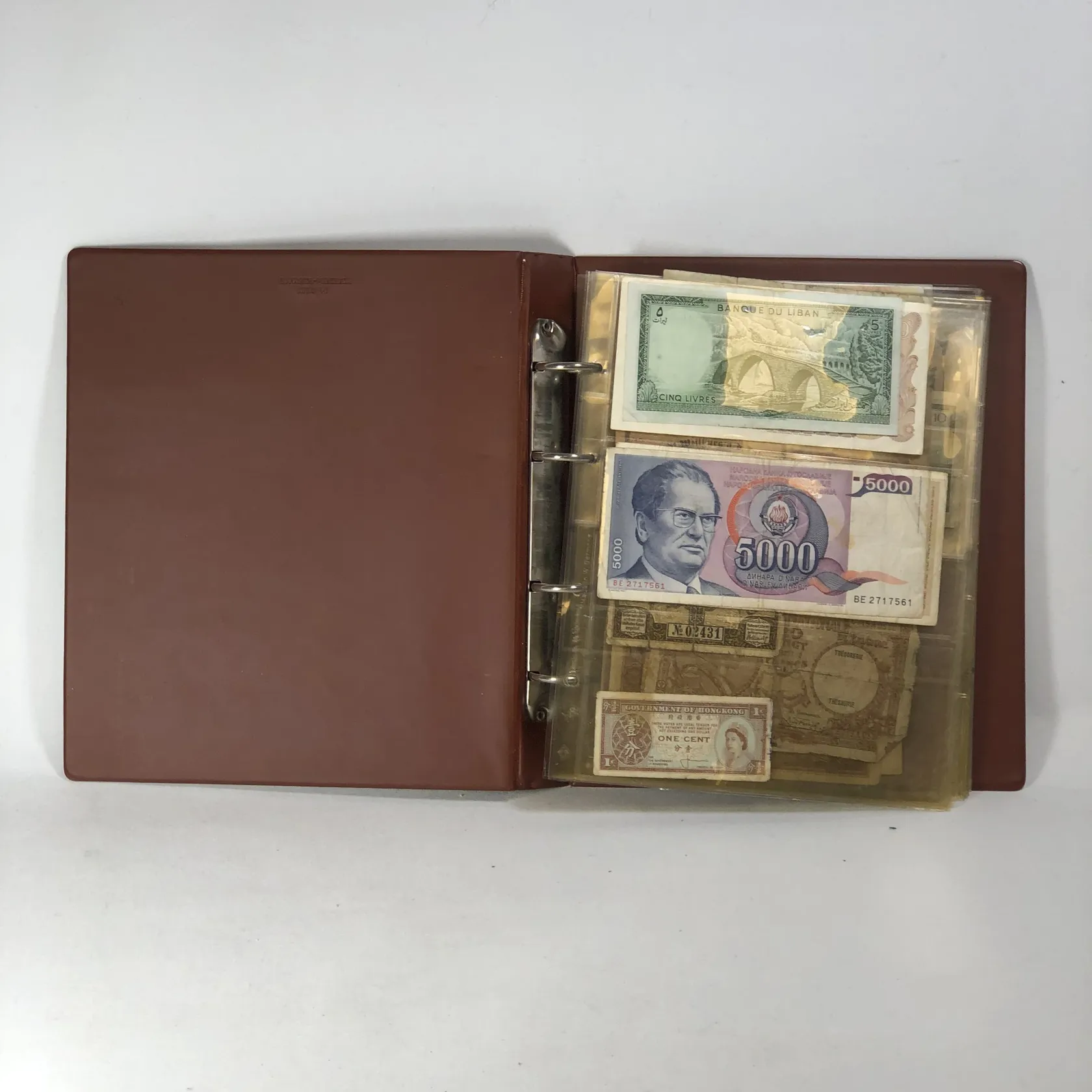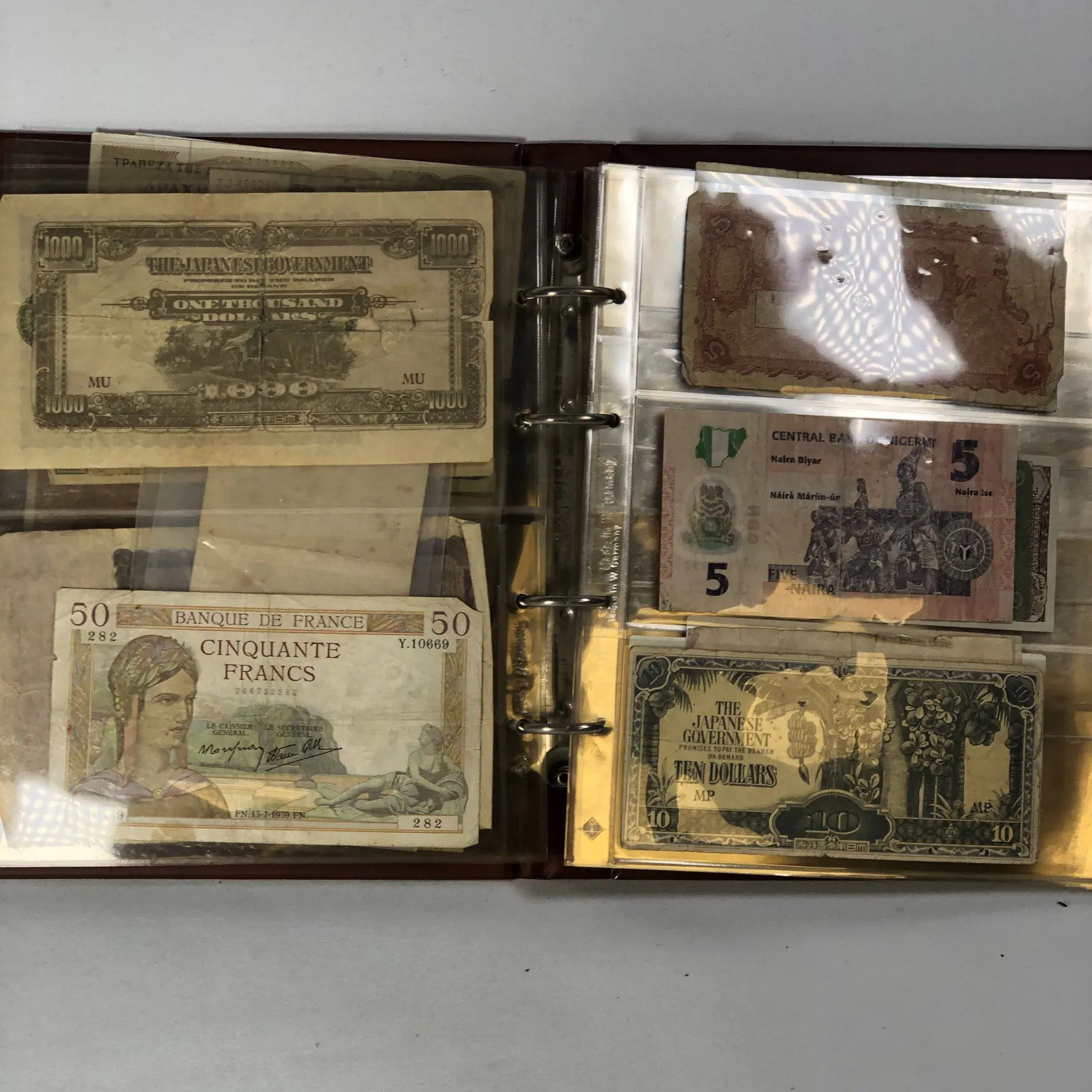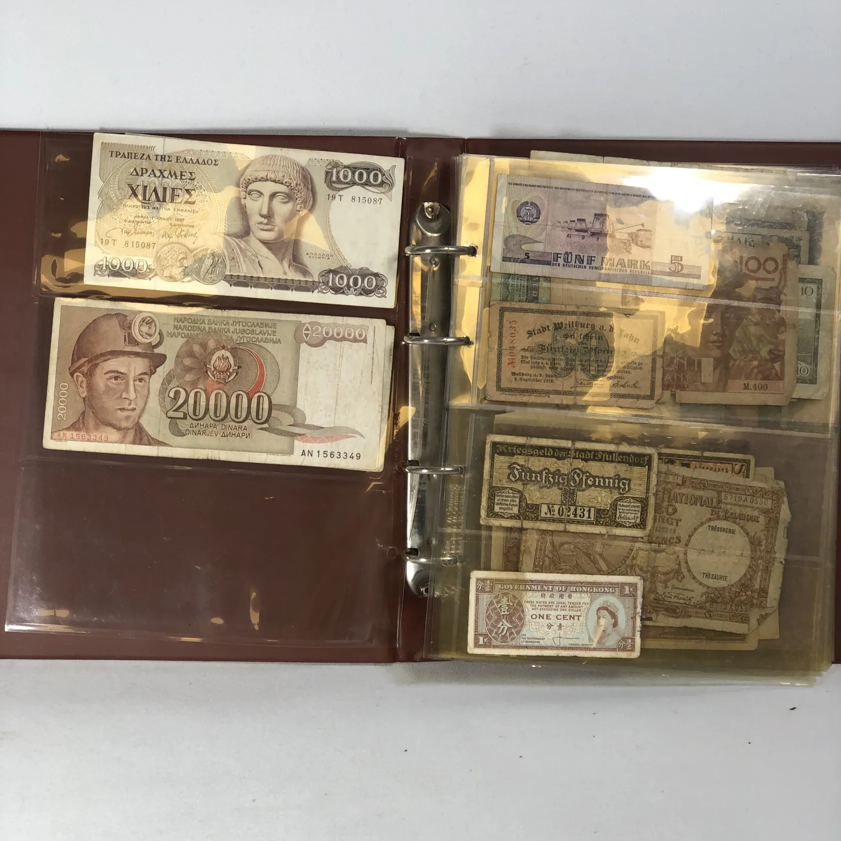 Album med sedlar av varierande ålder bl a Krigssedlar från första världskrigets Tyskland, Sovjetunionen 1921 Deutsche Reichsbahn 1923 5 och 10 miljoner mark samt 5 Miljarder mark svenska sedlar såsom 2 st 50 kronor med Jenny Lind (ocirkulerade) 2 st 100 kronor 1961 och 1962 2 st 10 kronor 1944 och 1949 totalt ca 50 st sedlar i varierande skick