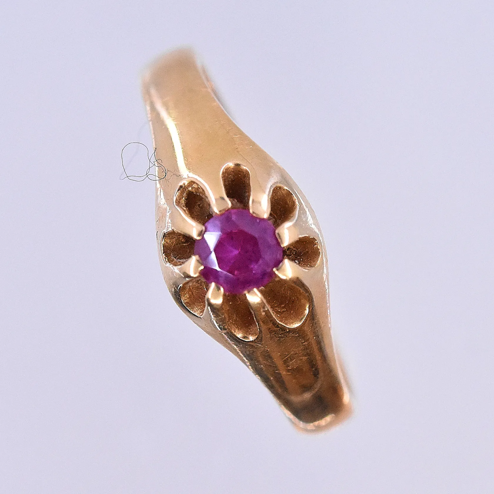 Ring med cerise sten, stl 18, bredd 3-8 mm, 18K. Vikt: 3,6 g.