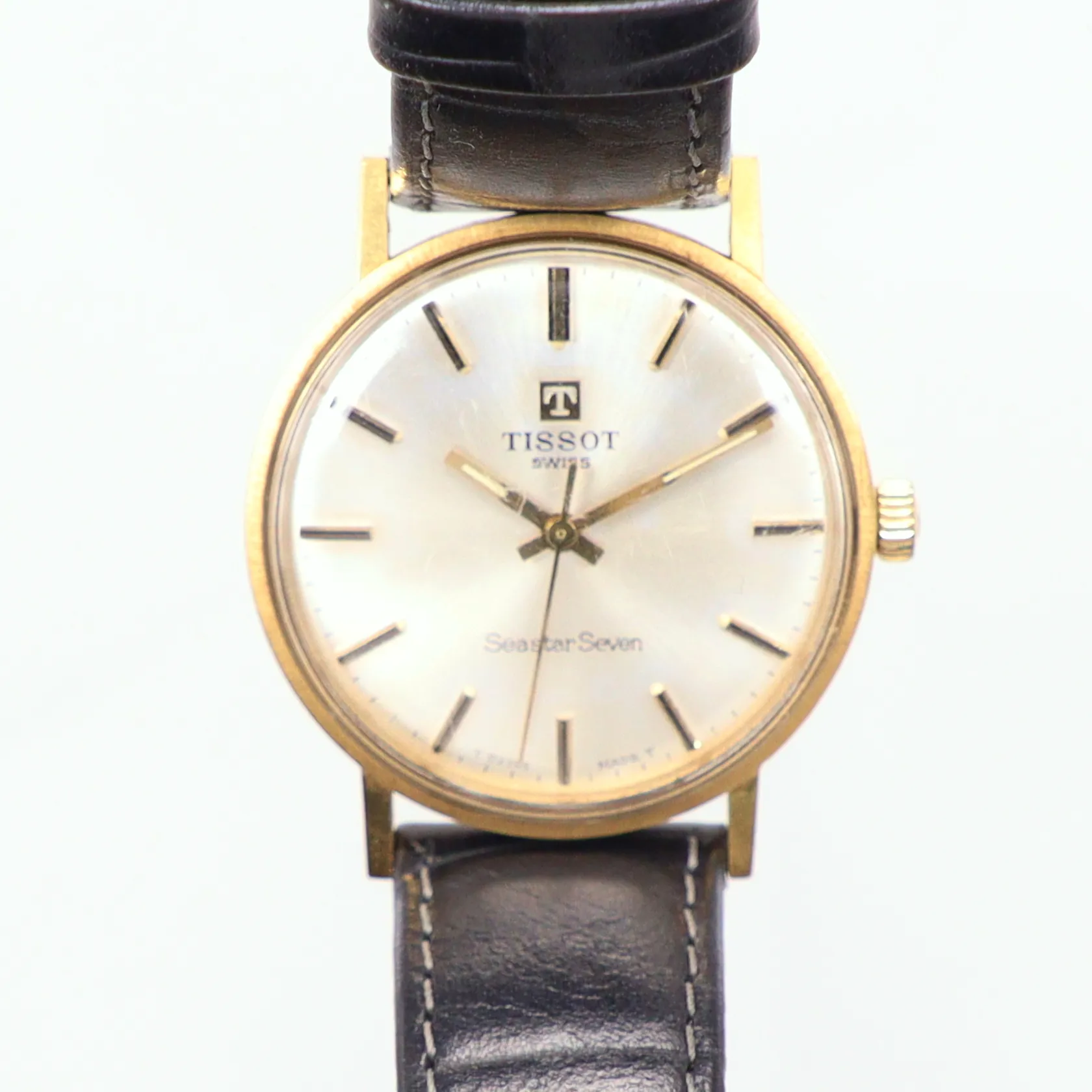 Herrur Tissot Seastar seven mekanisk Ø33, gravyr, läderband, box, 18k