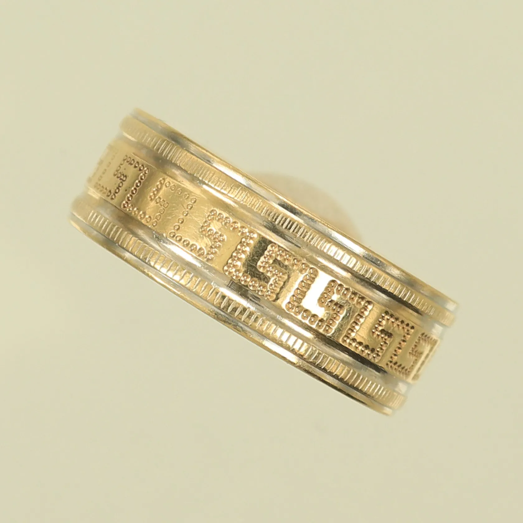 Ring med meandermönster stl 20¼ bredd 7,5mm 14K Vikt: 4,7 g.