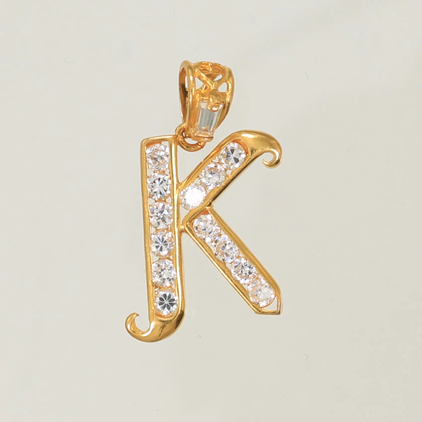 Hänge "K" med vita stenar 22x13mm inklusive hängöglan 21K bruttovikt 2,1g Vikt: 2,1 g.