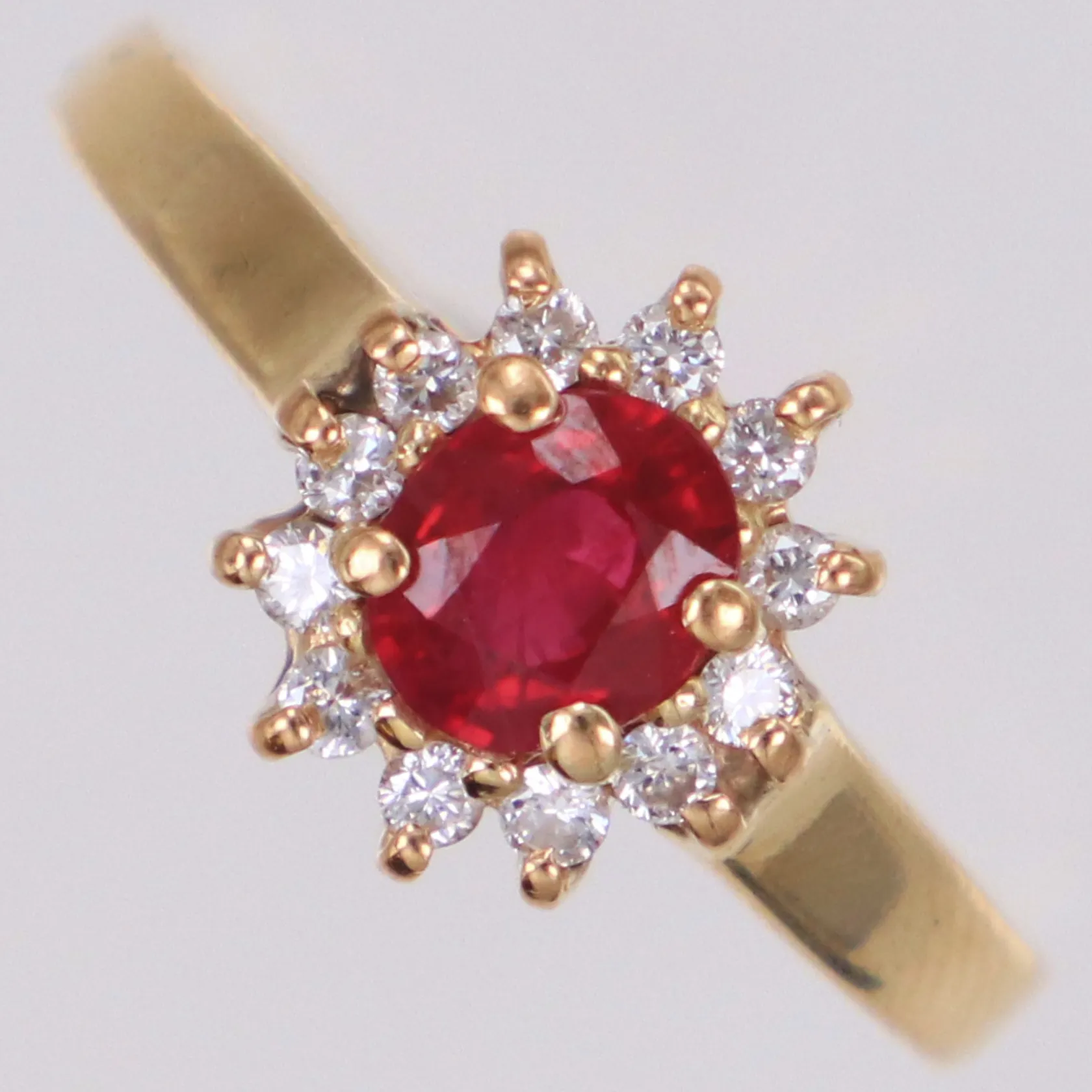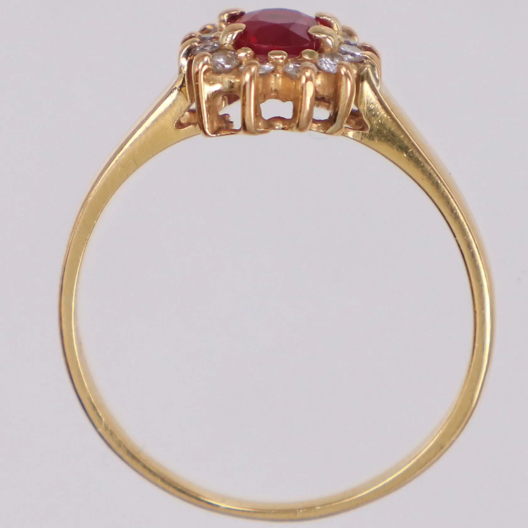 Carmoséring med diamanter 12xca0,02ct och röd sten, stl 18¼, bredd 1,6-9,8mm, 18K Vikt: 2,9 g.