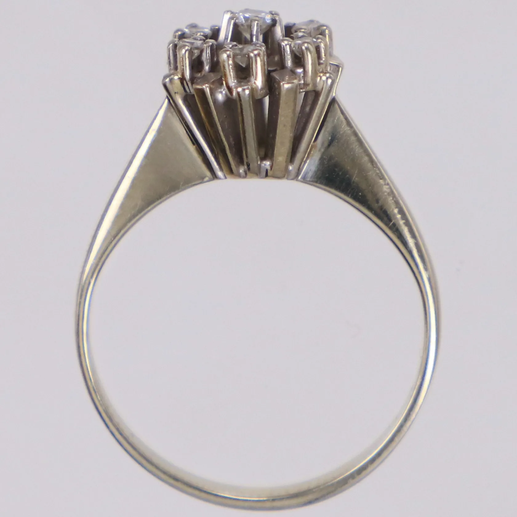 Ring med diamanter 1xca0,04ct, 6xca0,015ct, stl 15½, bredd 1,2-9,3mm, vitguld, 18K Vikt: 3 g.