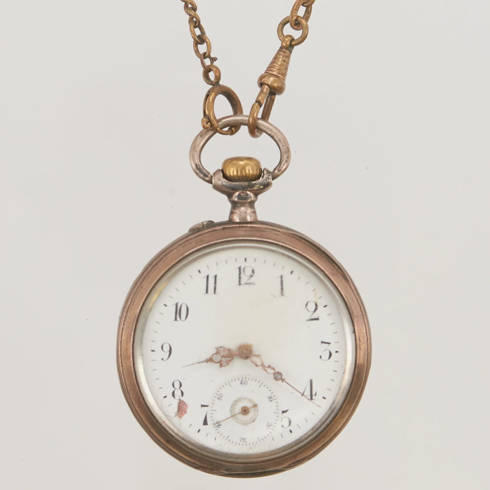Fickur, 48mm, gravyr, skadad, kedja i oädel metall, 800/1000 Silver.