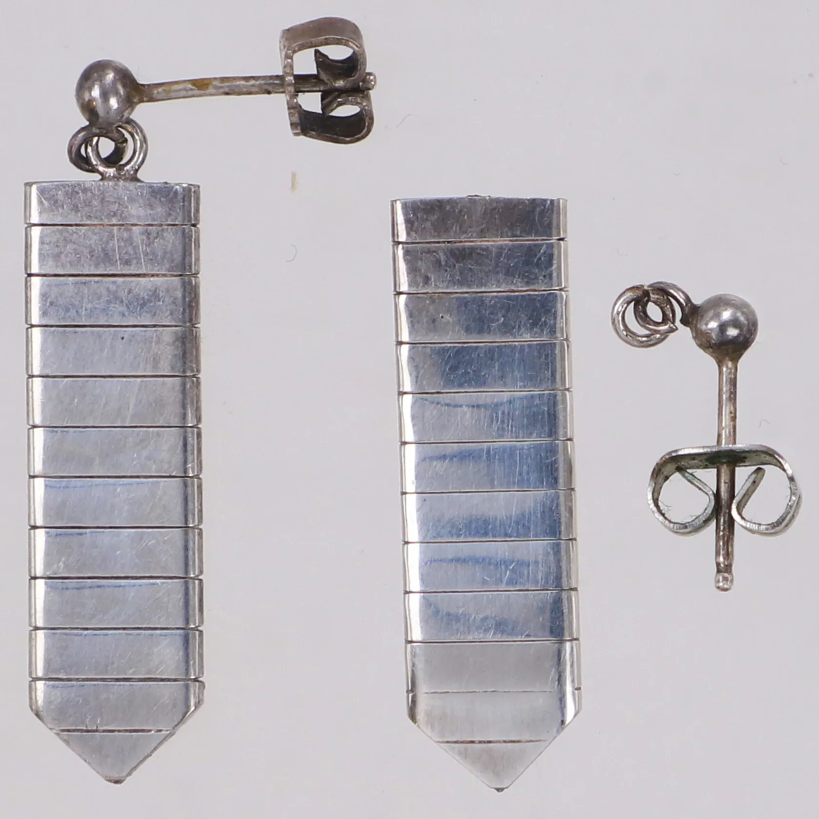 Ett par örhängen, längd 33mm, bredd 8mm, ett trasigt, silver 835/1000 Vikt: 4,8 g.