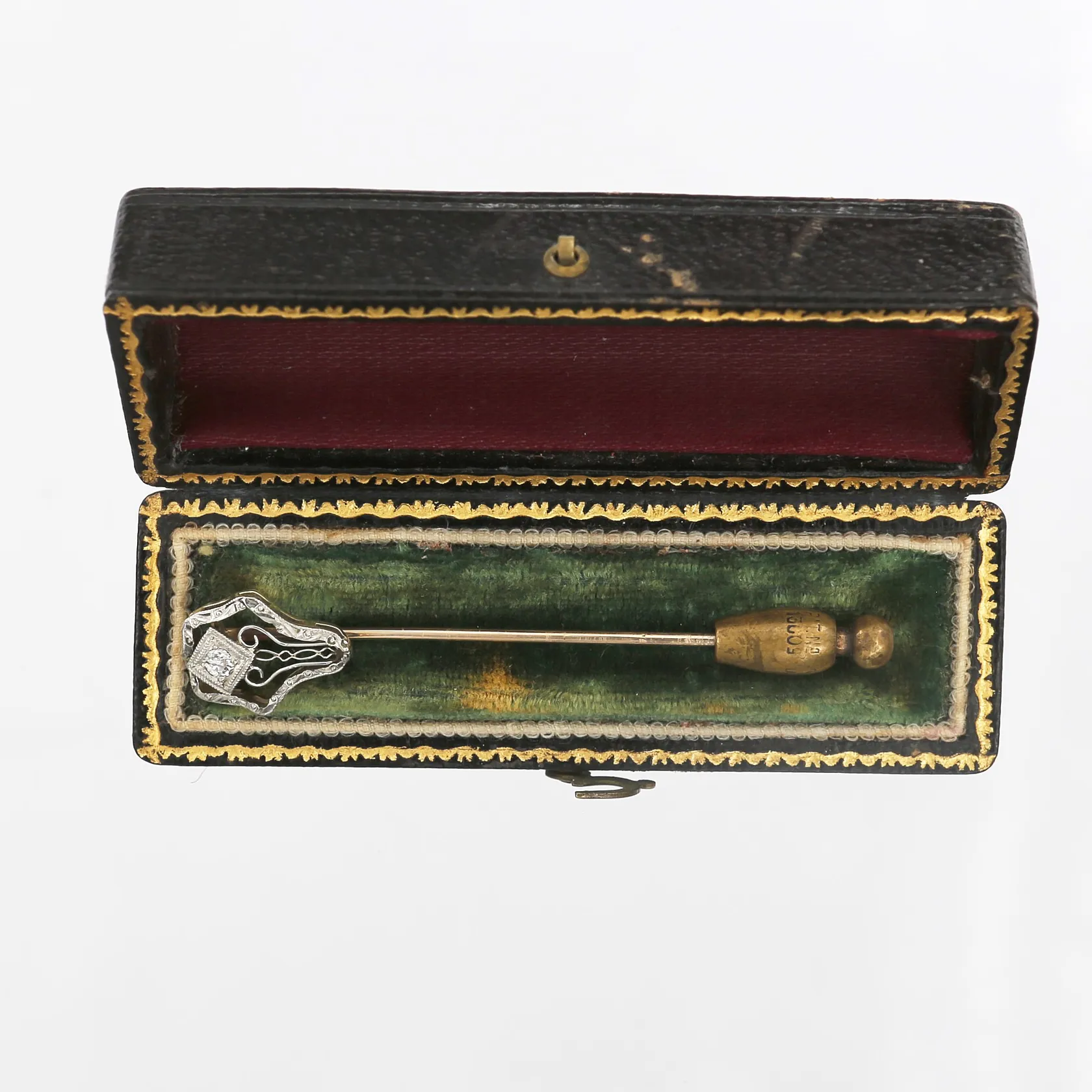 Broschnål med gammalslipad diamant ca 0,05ct, nagg, längd 58mm, 14K guld samt platina, stopp i metall, originalask Vikt: 1,7 g.