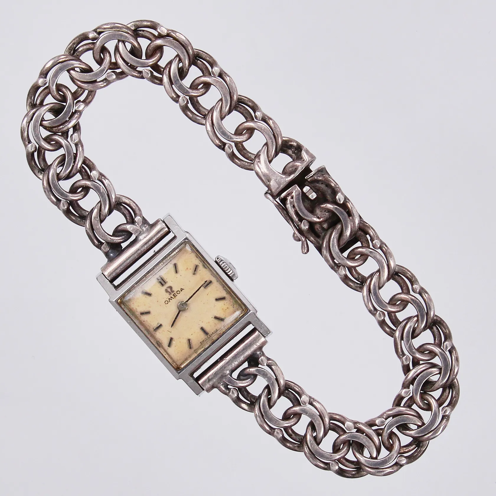 Damur Omega Ø ca 16,5x17,5mm, manuell, stål, boettnr 511.078. repigt plastglas, med Bismarckslänk längd: ca 18,5cm bredd: ca 9mm, silver 830/1000, inga tillbehör Vikt: 15 g.