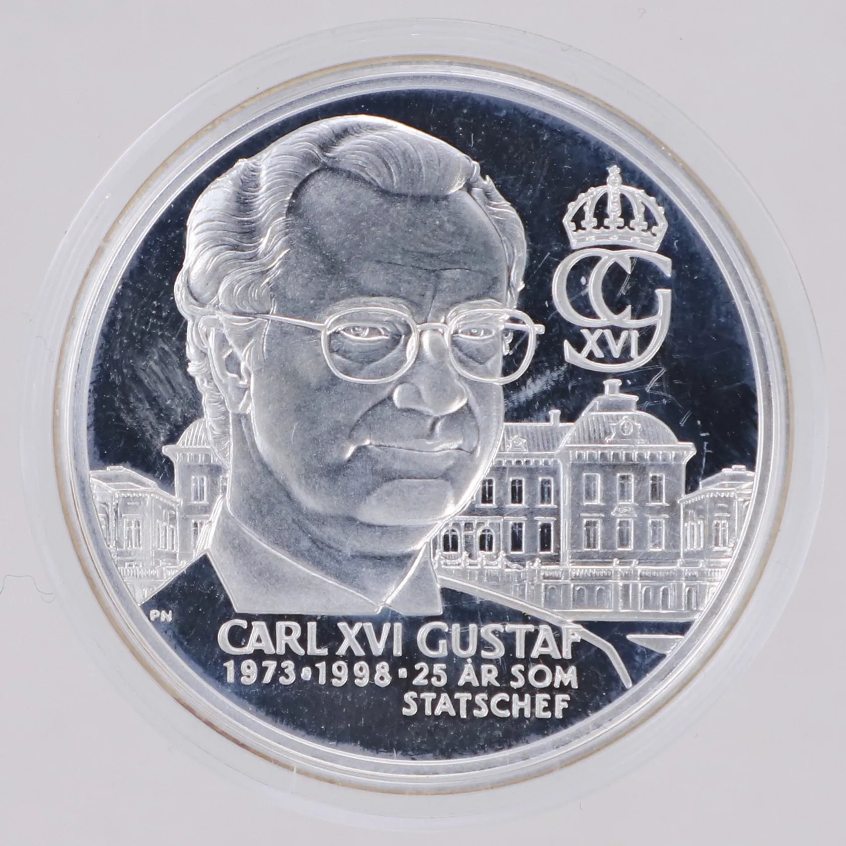 Minnesmynt Carl XVI Gustaf 25 år som statschef, år 1998, Kungariket Sverige, 925/1000 silver, plastetui Vikt: 26,2 g.