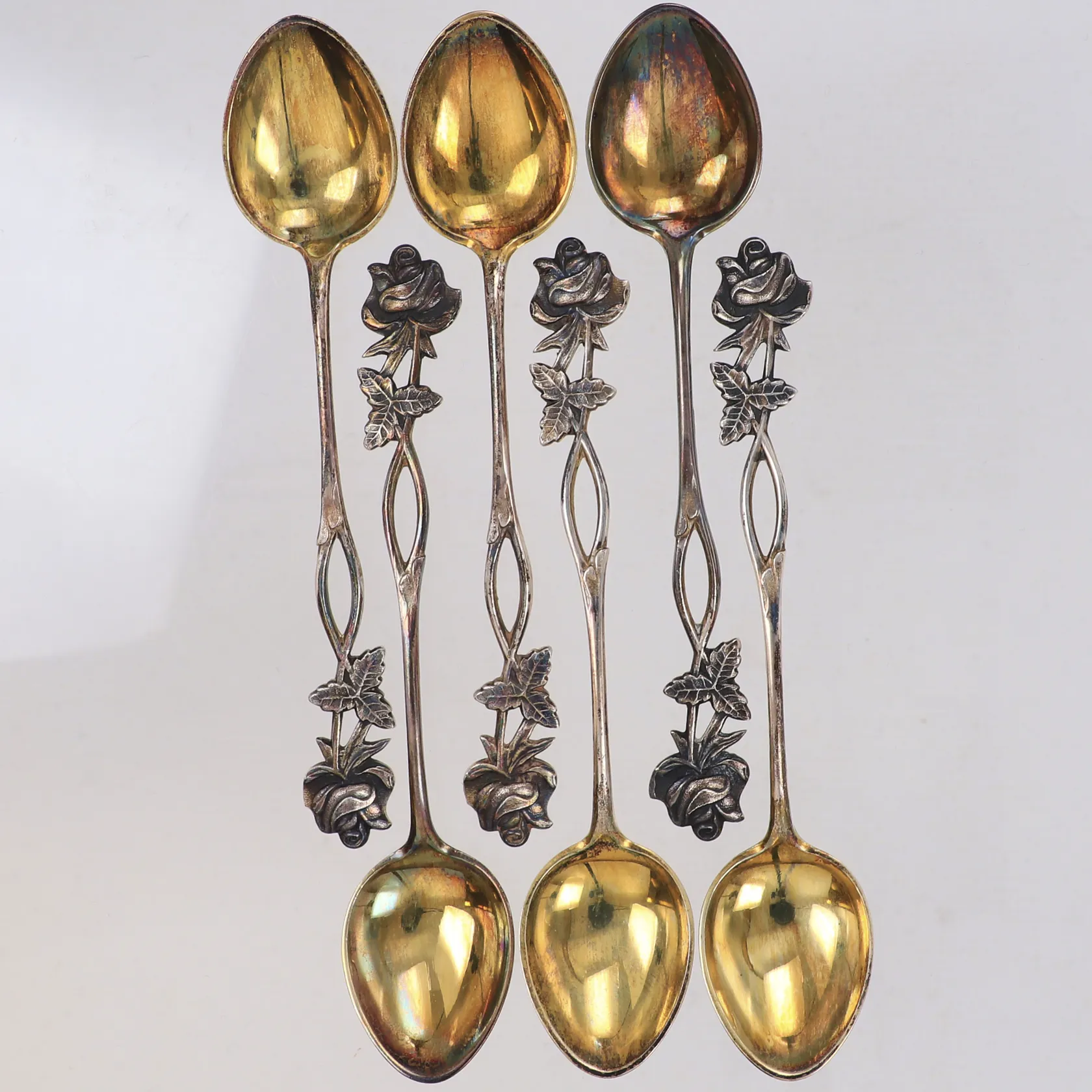 6 Skedar Rosen, längd 11cm, delvis förgyllda, 813/1000 silver Vikt: 54,3 g.