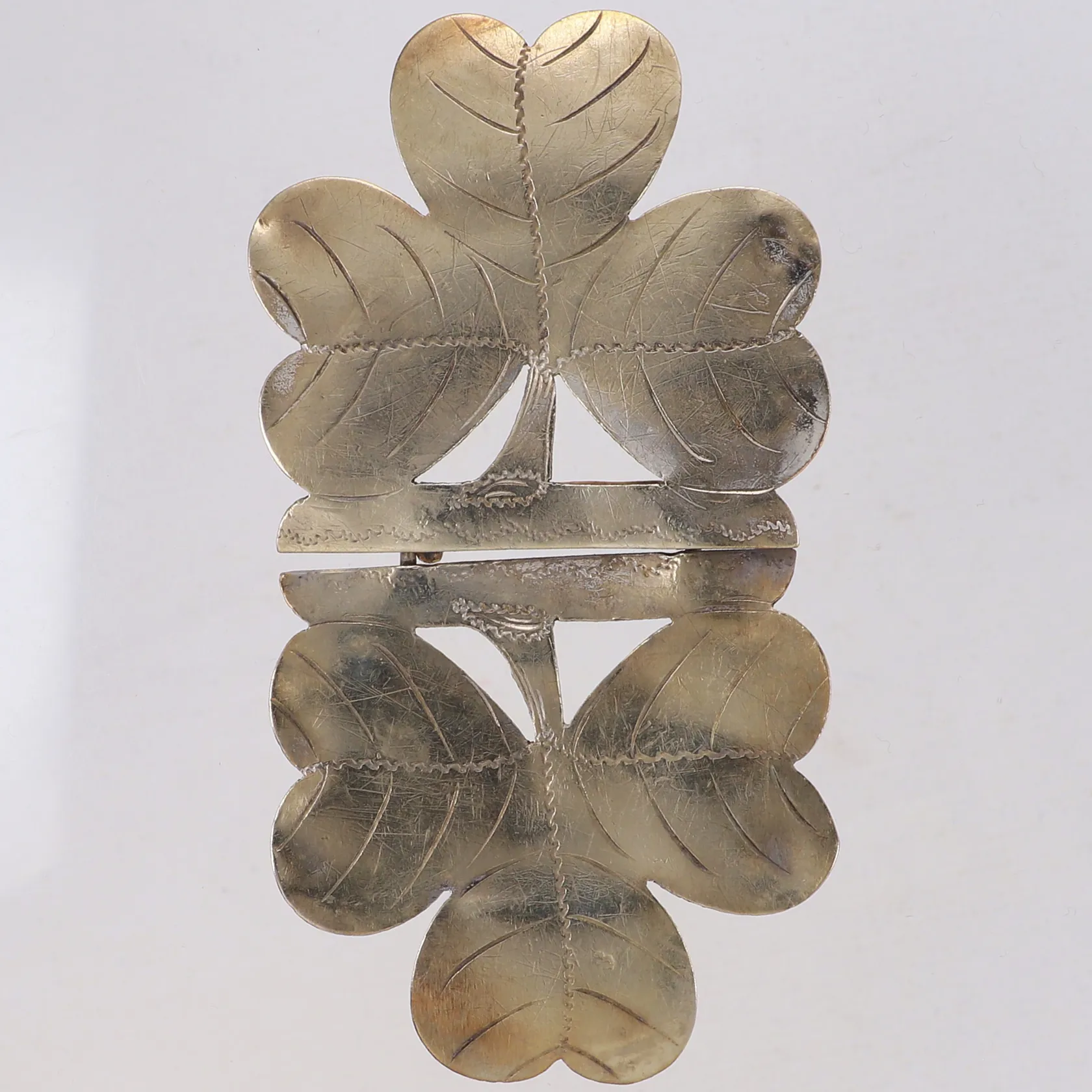 Skärpspänne, treklöverform, längd 10cm, höjd 5,5cm, signerat N.S, bucklor, vitmetall