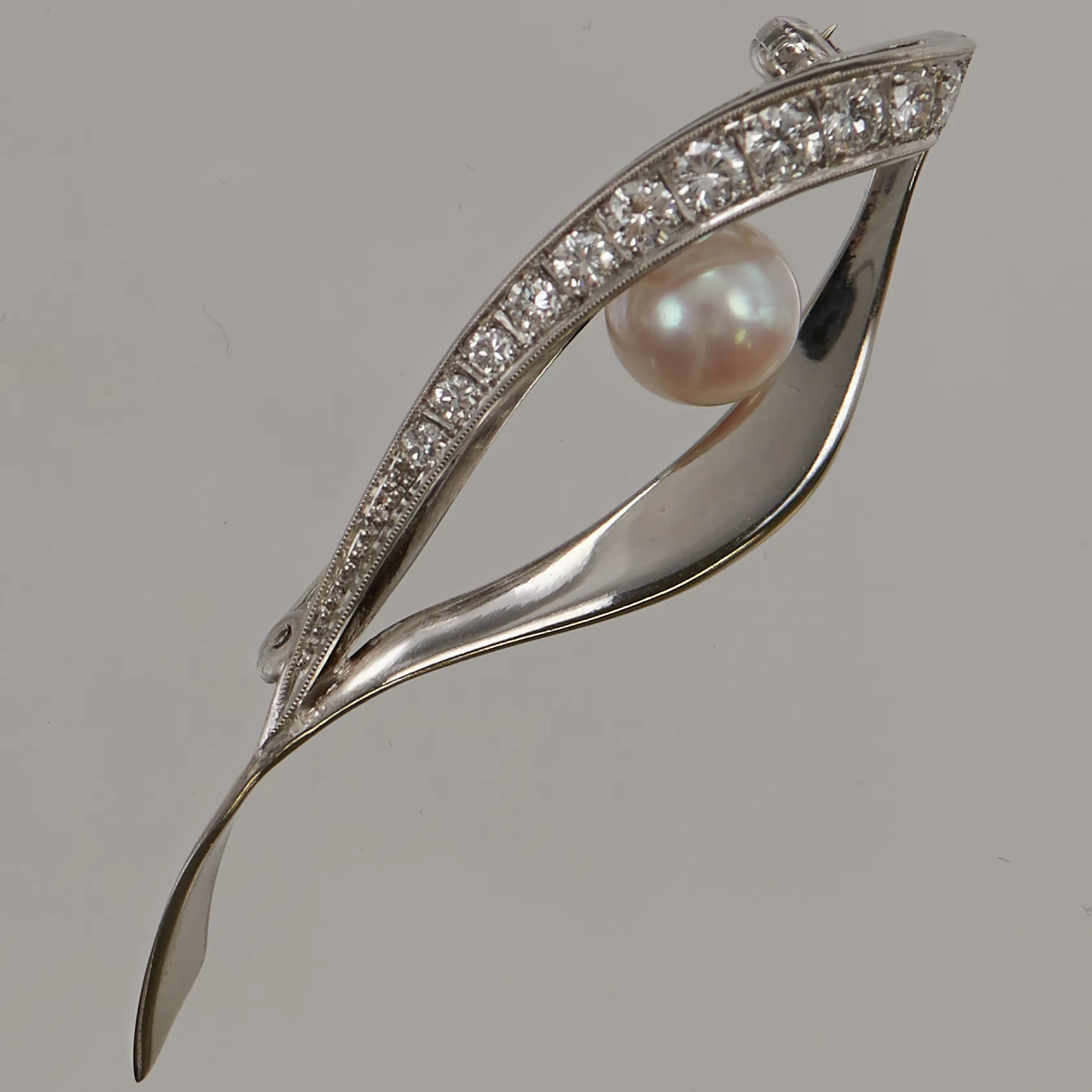 Brosch 11x diamanter 0,64ctv enligt gravyr, kvalitet ca TW-W/VS, 51mm, odlad pärla ca 7mm, Mema Guld & Silver Ab 1967, vitguld 18K 5,3g. Vikt: 5,3 g.