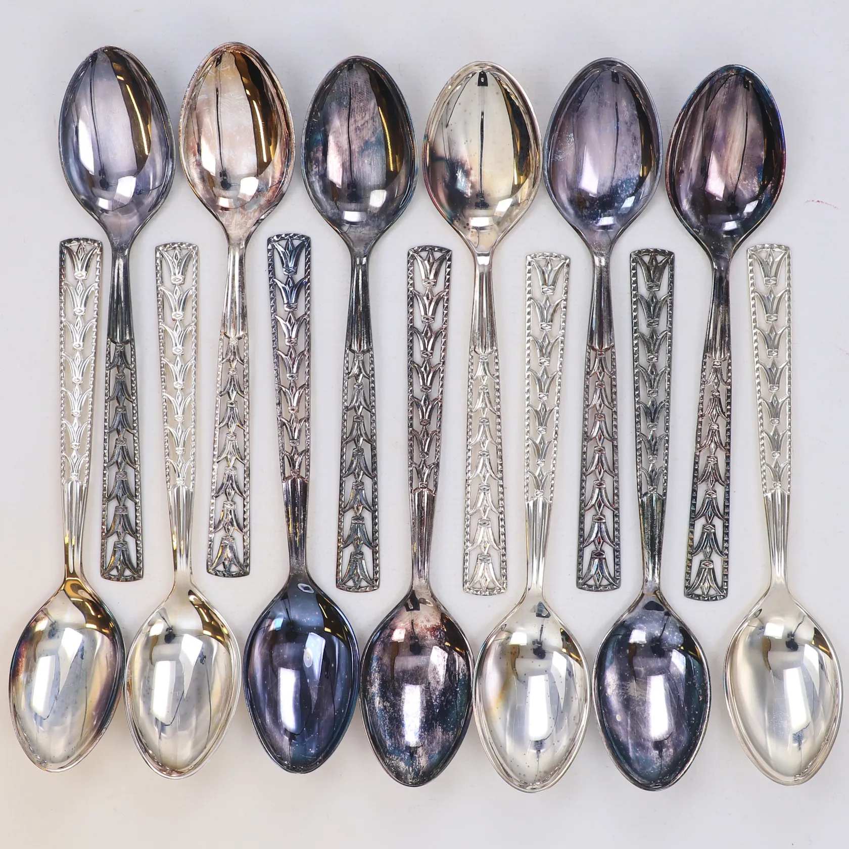 13 skedar, längd 15cm, modell Victoria, GEWE, oxiderade, 830/1000 silver Vikt: 281,4 g.