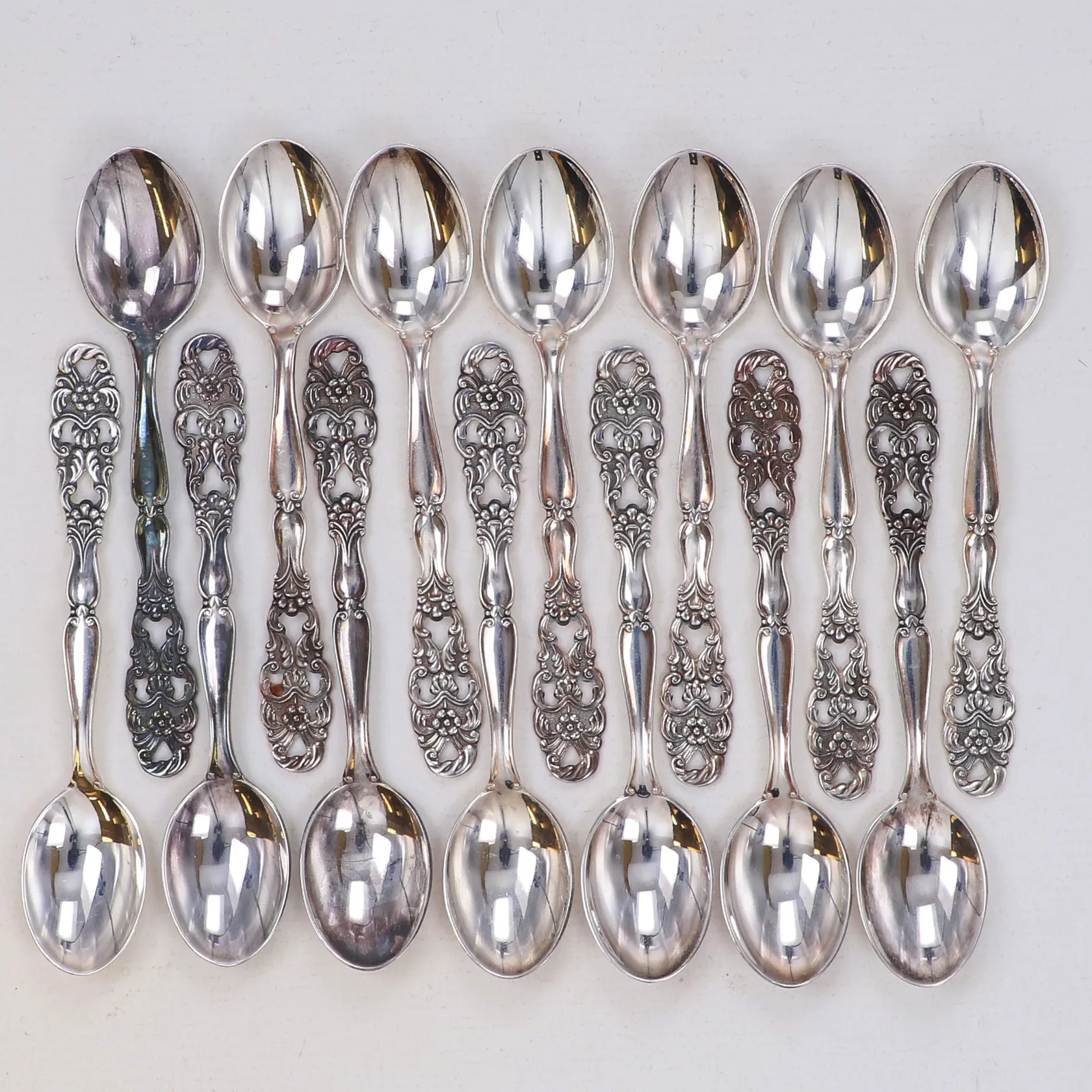 14 mockaskedar, längd 10cm, GAB, 830/1000 silver Vikt: 114,1 g.