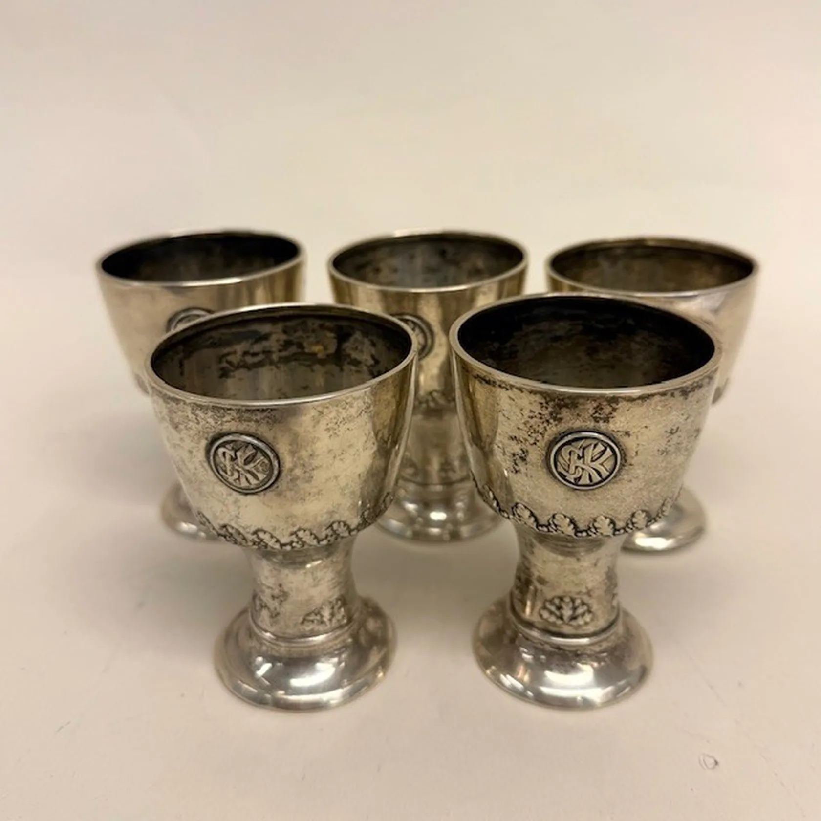 5 Bägare på fot, höjd 8,5cm, Ø6cm, bucklor, gravyr, silver 830/1000 Vikt: 210,1 g.
