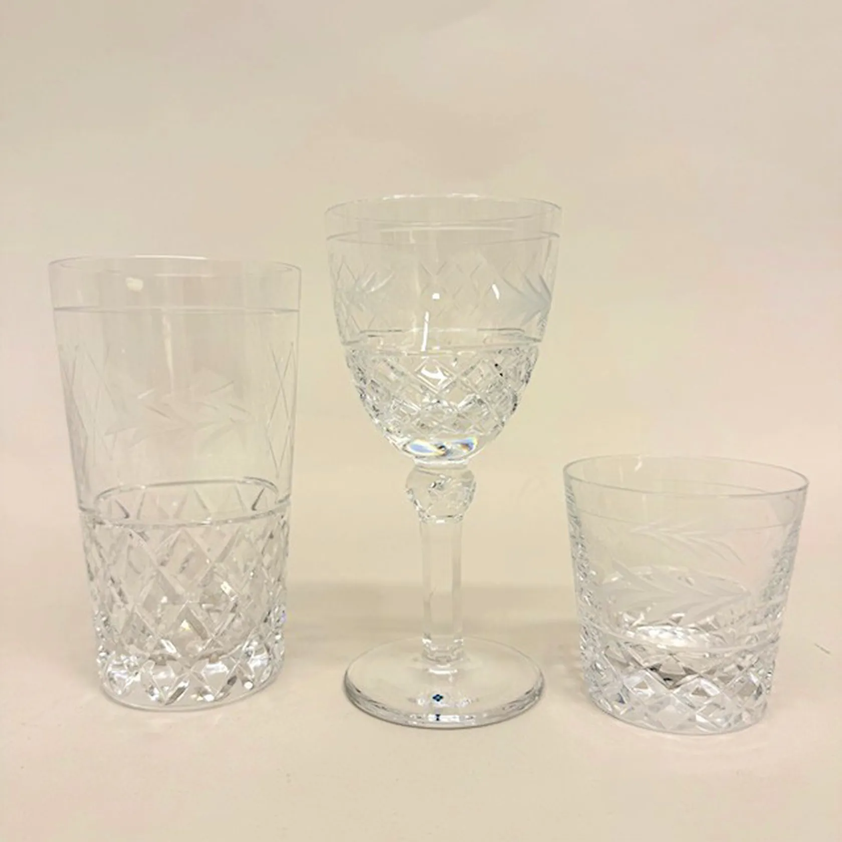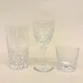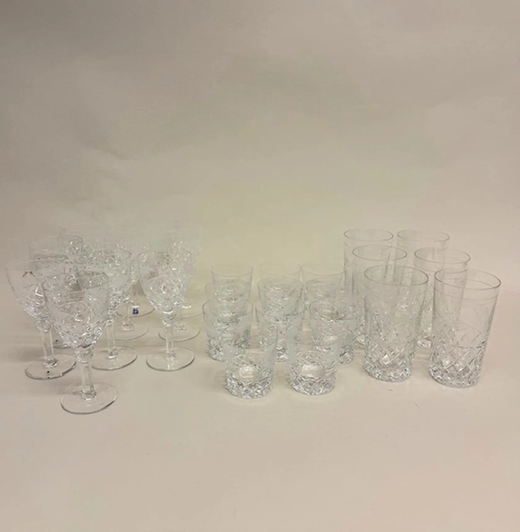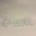 6 grogglas, höjd 13,5cm, 11 selterglas, höjd 73mm (varav 4 med nagg), 9 vitvinsglas, höjd 15,4cm, (varav 4 med nagg), Christineholm Cristall,vissa etikettmärkta Fyrklövern, slipad kristall Specialfrakt, kontakta pantbankskontoret för mer information..