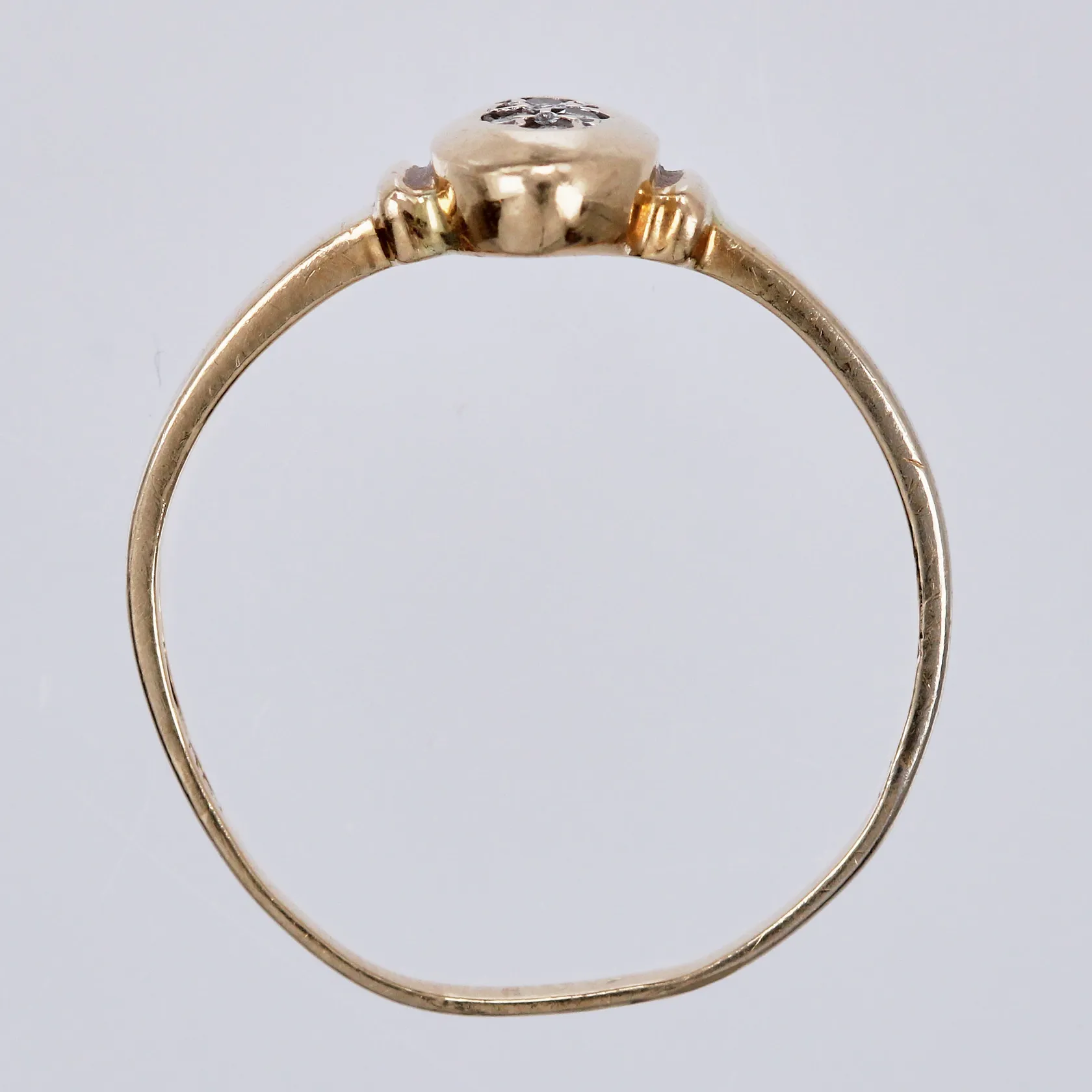 Ring med diamanter ca 3x0,01ct, bucklig skena, stl: 17¾, bredd ca 1-8mm, GFAB, 18K Vikt: 1,7 g.
