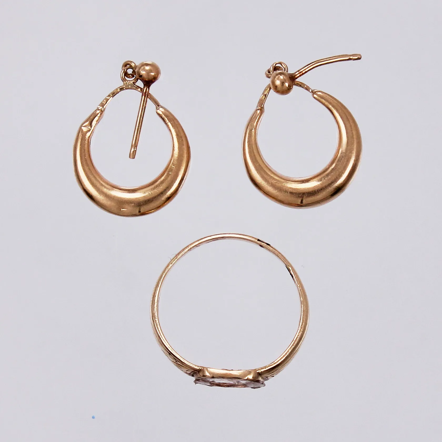 Ett par örhängen, 1 ring, defekta, bucklor, 18K Vikt: 5,1 g.