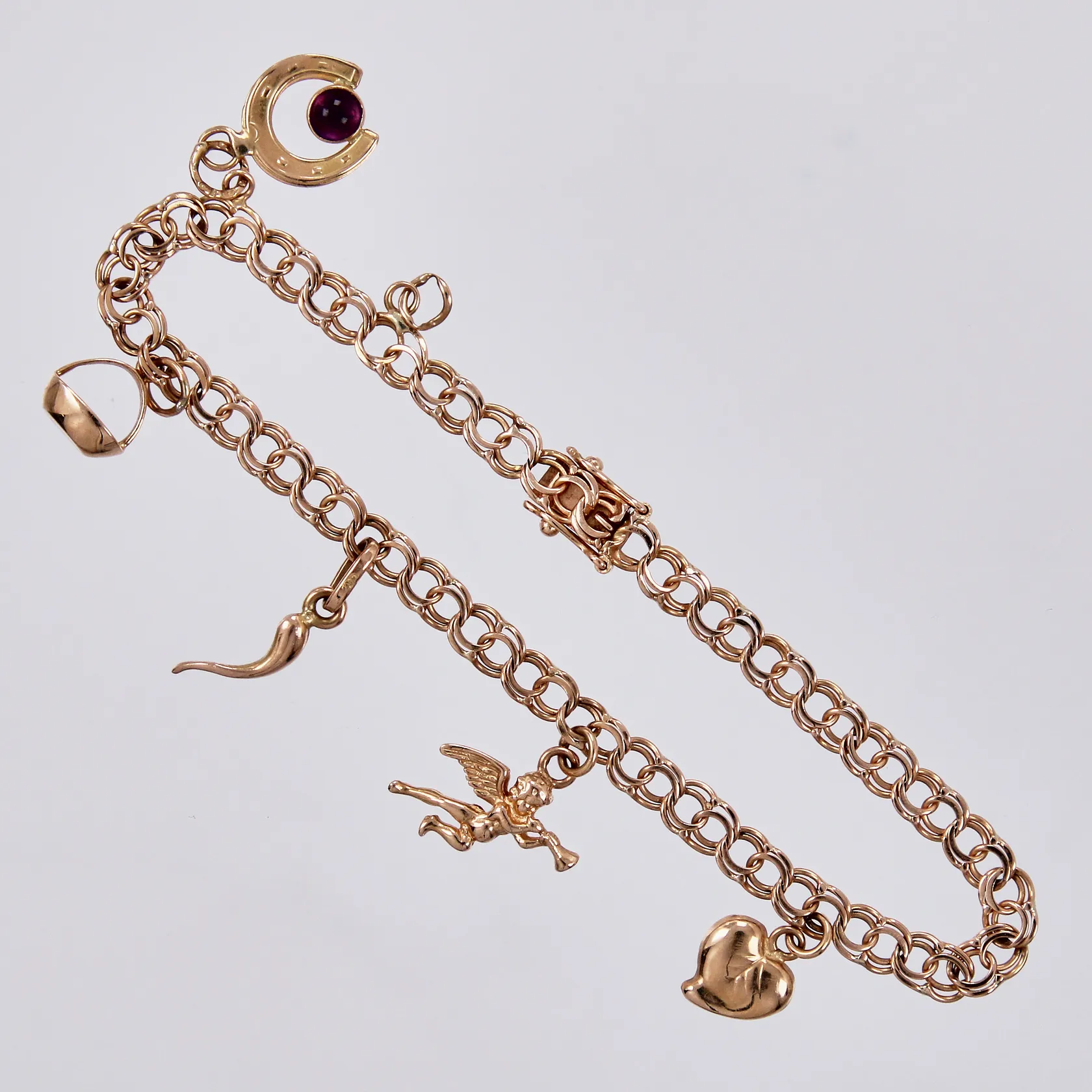 Armband Bismarck med 5 berlocker, MKS stockholm 1959, längd ca 18,5cm, bredd ca 4mm, 18K Vikt: 7,6 g.