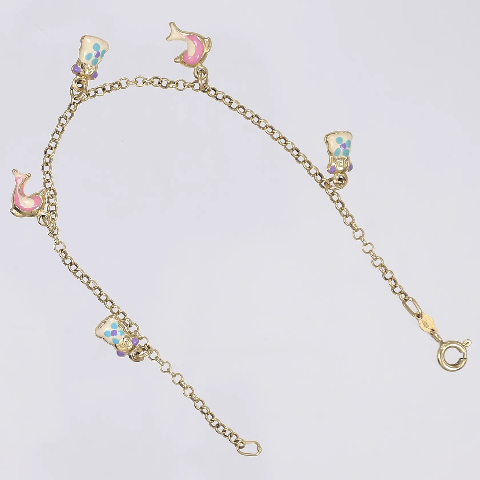 Armband med fem berlocker med emaljdekor längd 18cm bredd 2mm 14K Vikt: 4,1 g.
