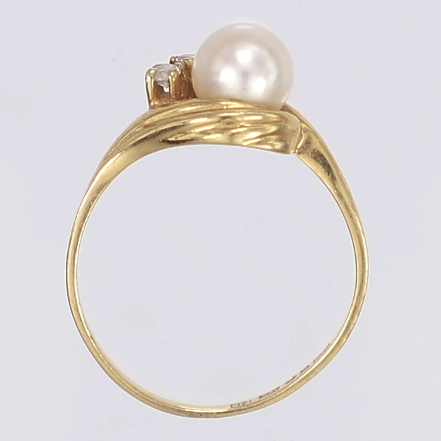 Ring med pärla och två små vita stenar stl 17 bredd 1-7mm Bengt Hallberg Köping 1989 något ojämn form 18K Vikt: 2,4 g.