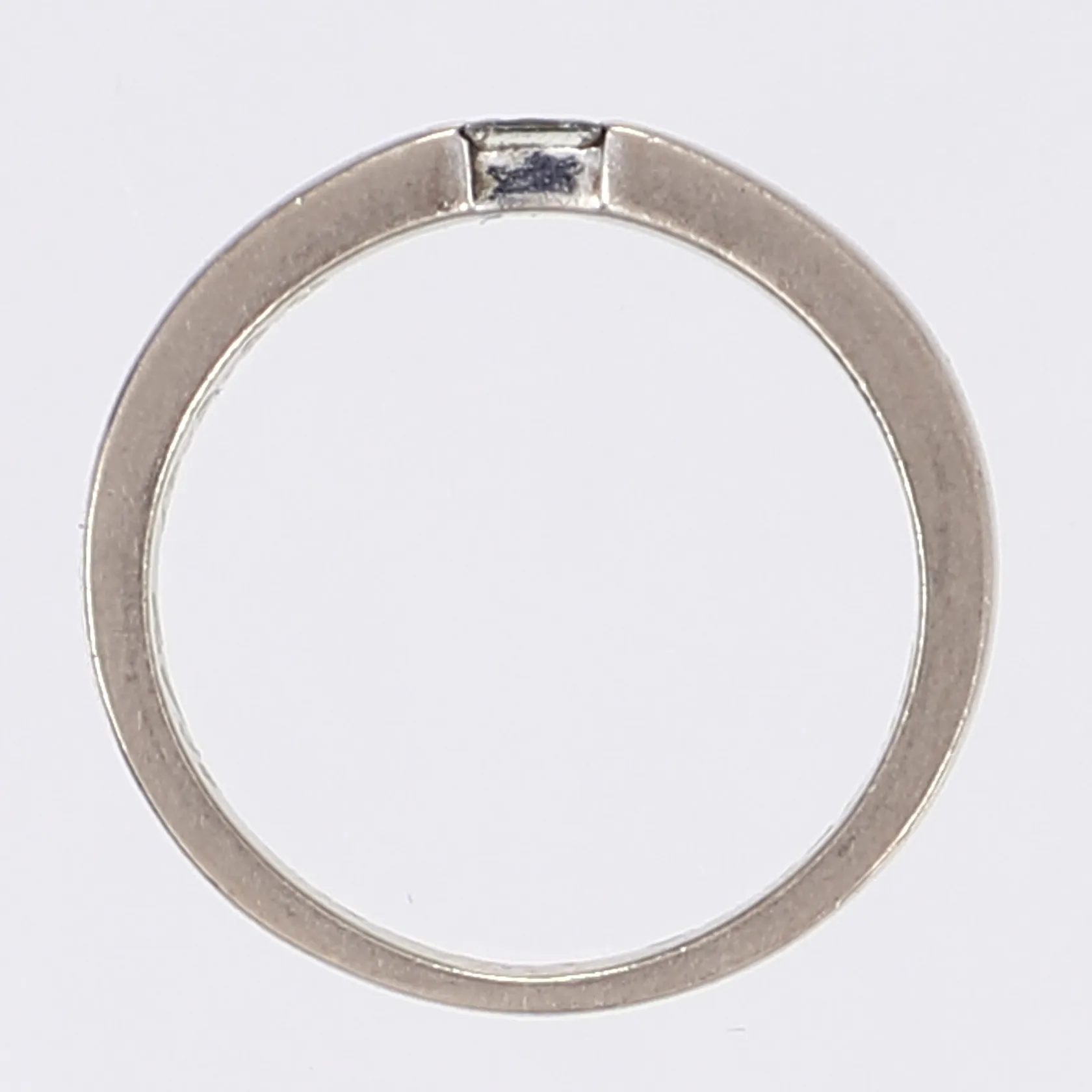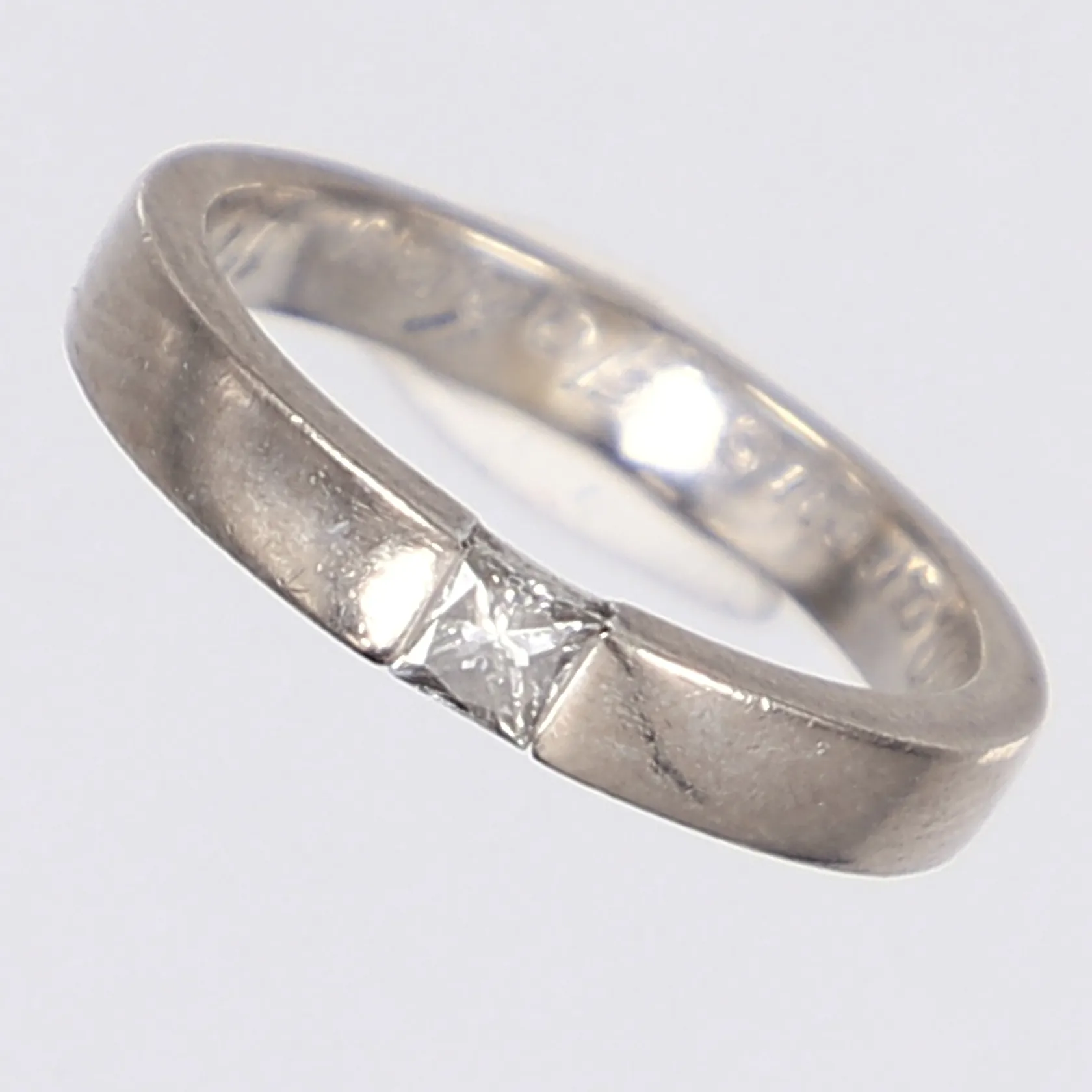 Ring med prinsesslipad diamant 1x0,15ct TW/SI enl. gravyr, stl 16, bredd 3mm, gravyr, vitguld 18K Vikt: 4,2 g.