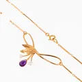 Stavcollier i 18K guld med ett fast mittparti med dekor av två odlade pärlor och en droppslipad ametist. Den är ca 42 cm lång 0,5 - 19 mm bred och väger 7,4g. Springring. Stämplat HE (Heribert Engelbert), stadsstämpel, kattfot, 18K, K9 (1960). Vikt: 7,4 g.