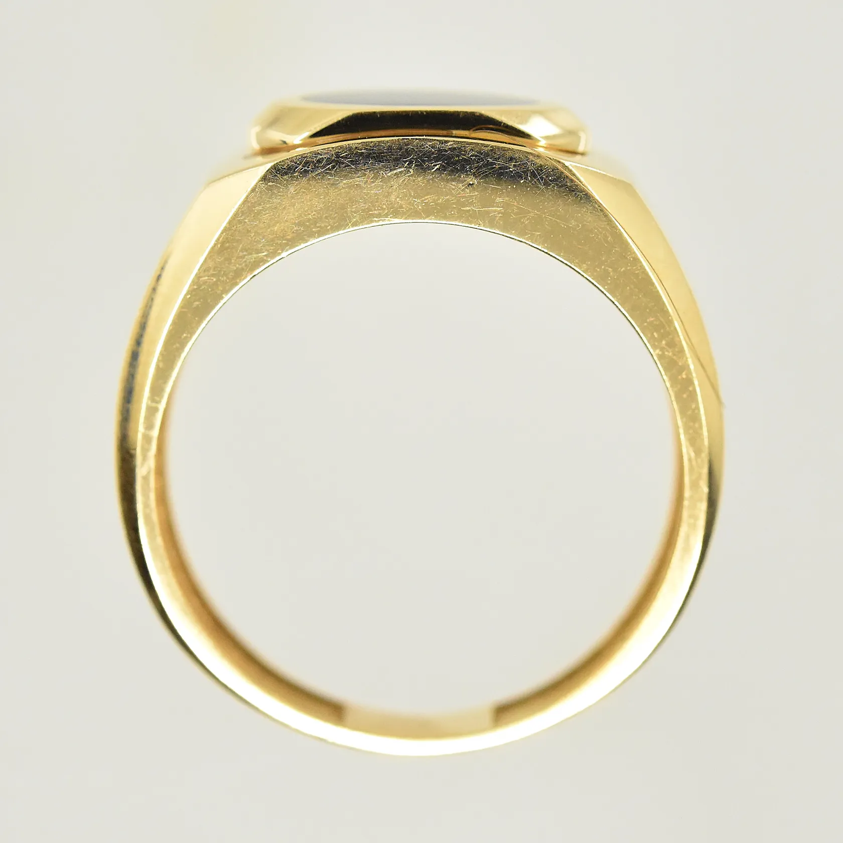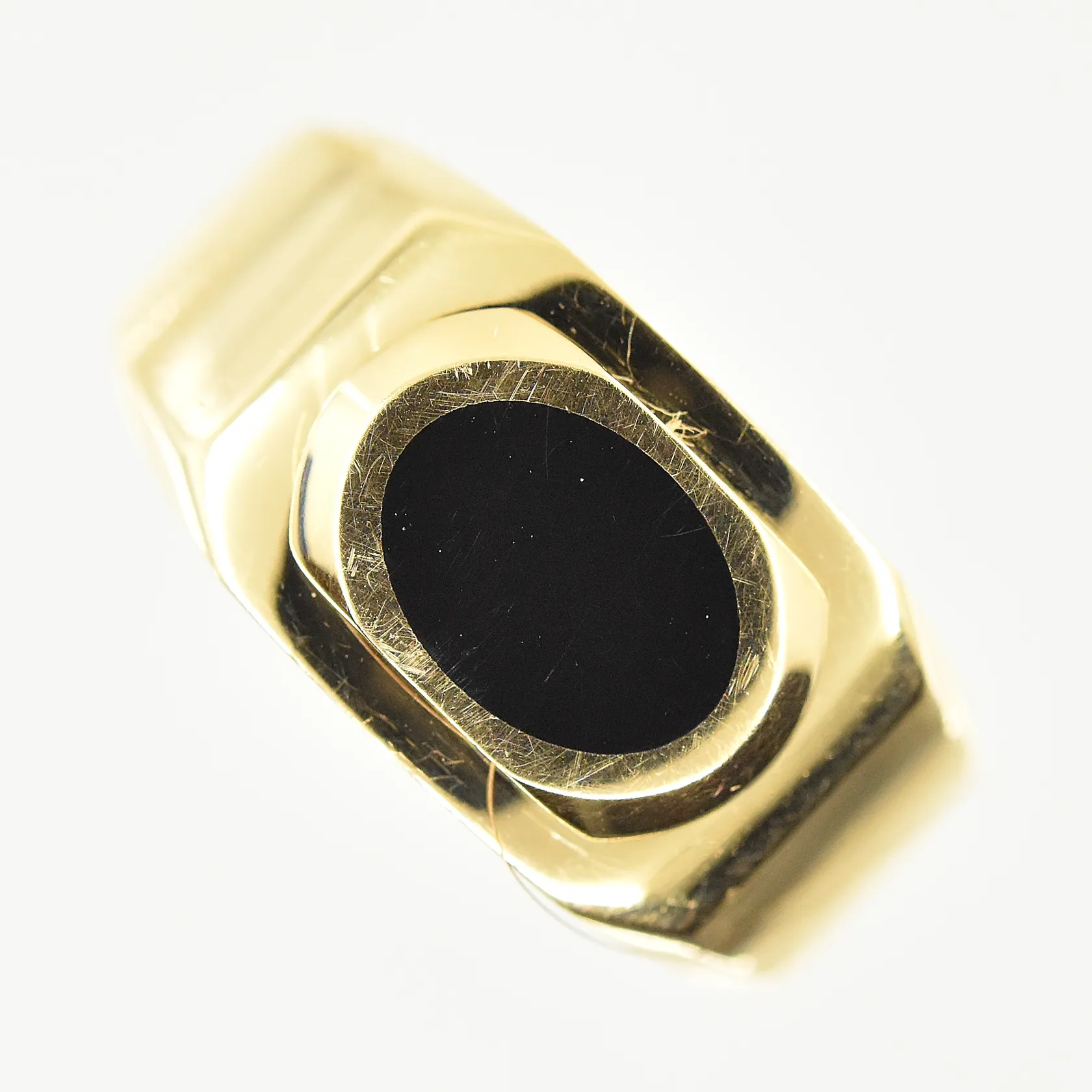 Klackring med onyxplatta, stl 19¼, bredd 5-11 mm, 18K. Vikt: 4,7 g.