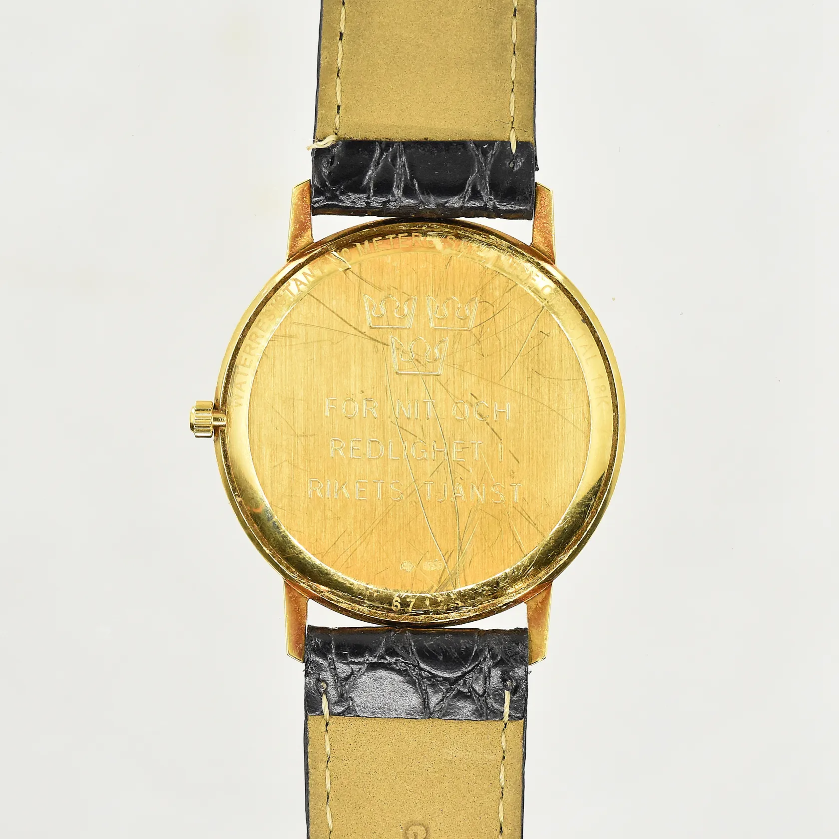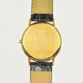 Herrur Tissot 18K, datum, quartz, boett Ø 34 mm, datum, gravyr på boett, fungerade vid testtillfället, svart läderarmband, etui.