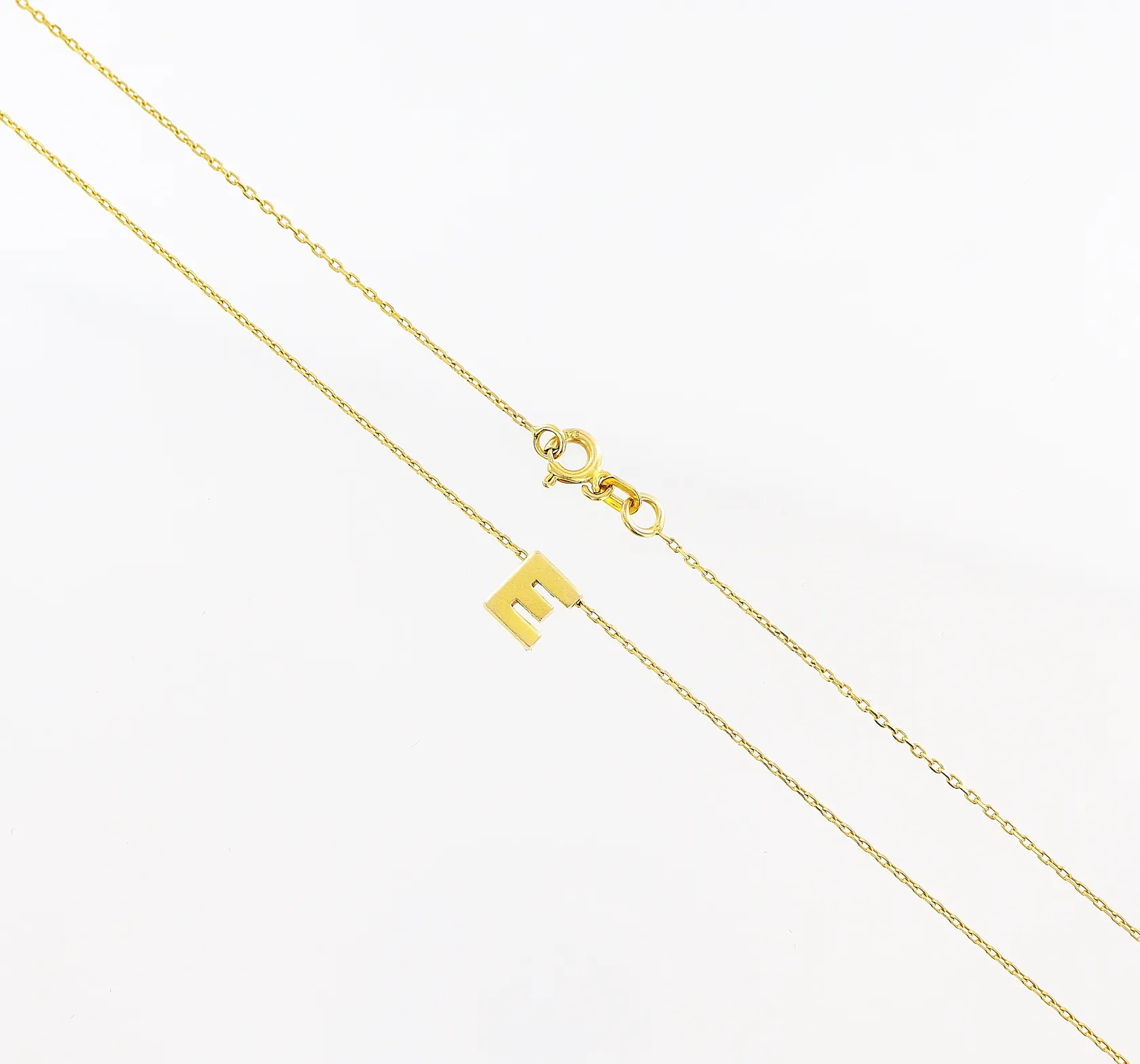 Collier, 44cm, bredd 0,4mm, integrerat hänge bokstaven "E", 6,4x5,4mm, 21K. Vikt: 2,5 g.
