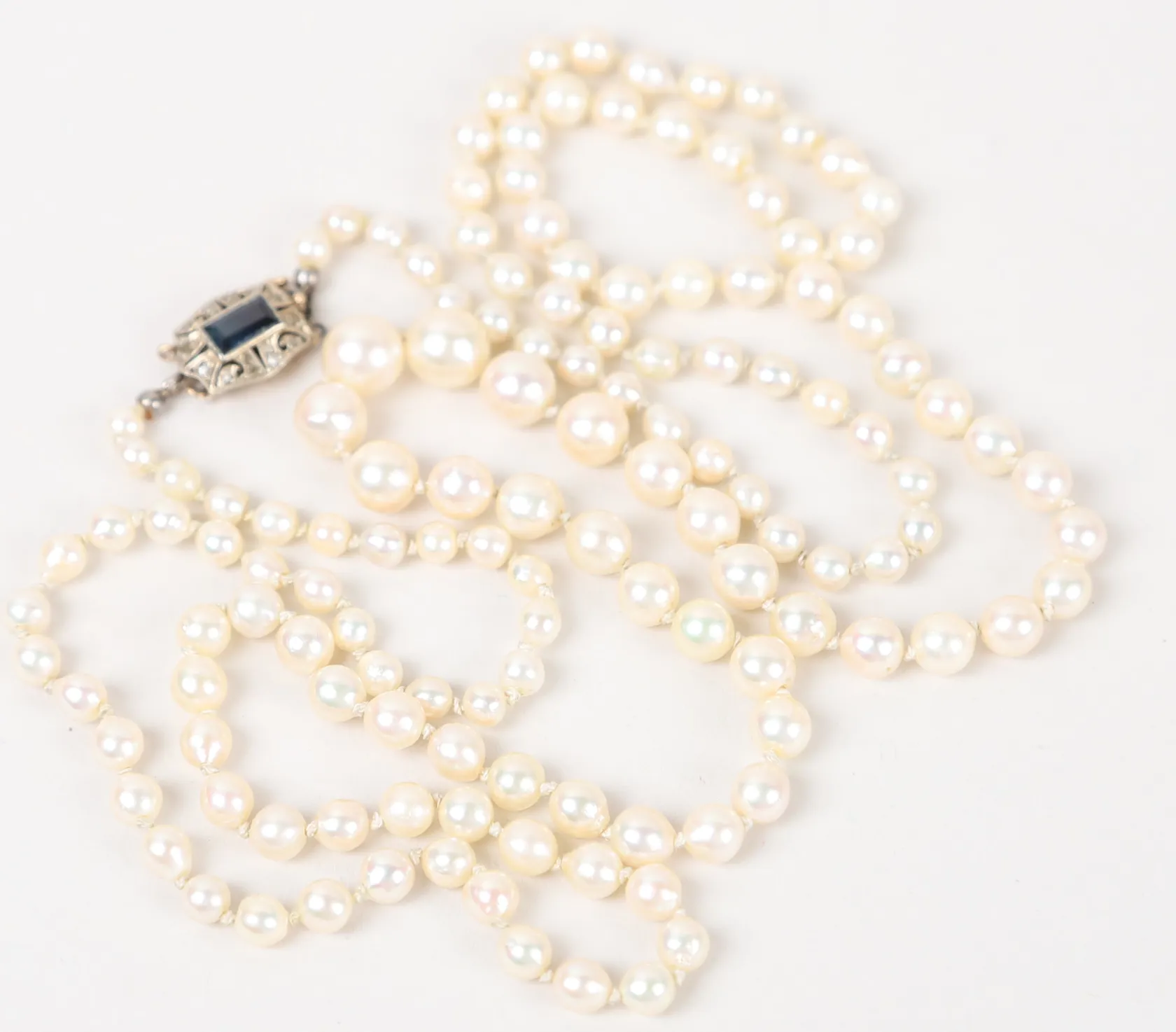 Pärlcollier med odlade saltvattenpärlor, Ø 3 -7mm, längd 82cm, lås med baguettslipad safir samt rosenslipade diamanter, 18K guld Vikt: 22,4 g.