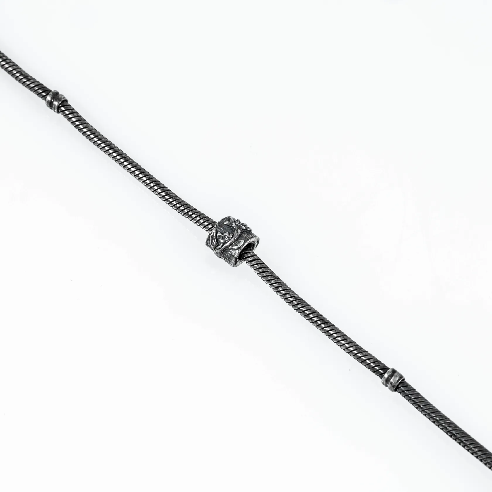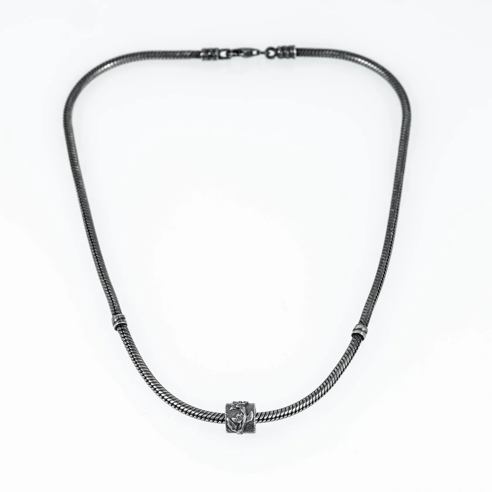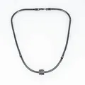 Pandora ormlänk i oxiderat silver med ett hänge. Den är 3 mm bred, hänget är 9,5 x 8 mm, och är 40 cm lång. Den väger 26,3g. Karbinhake. Vikt: 26,3 g.