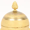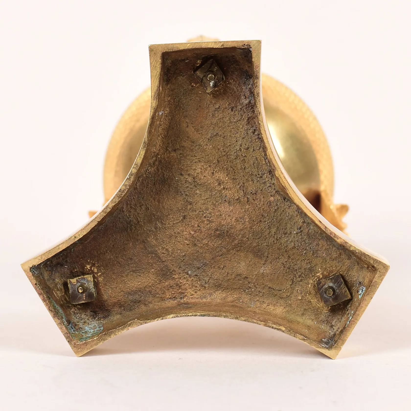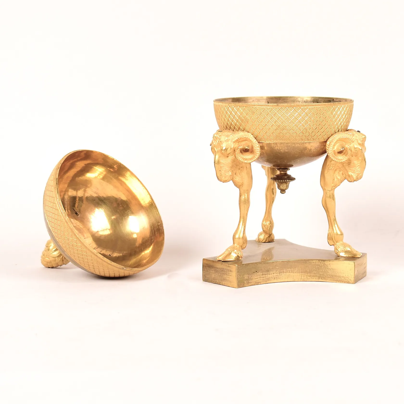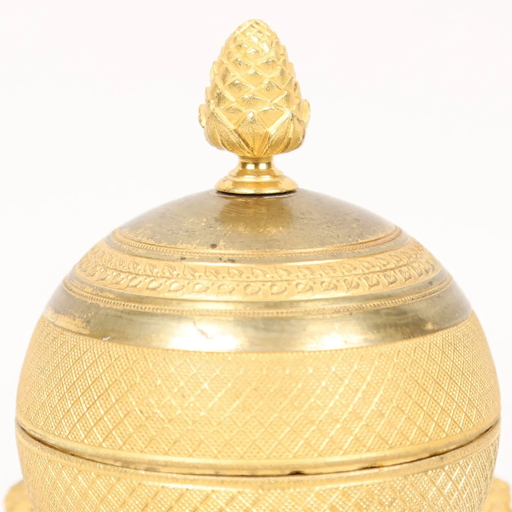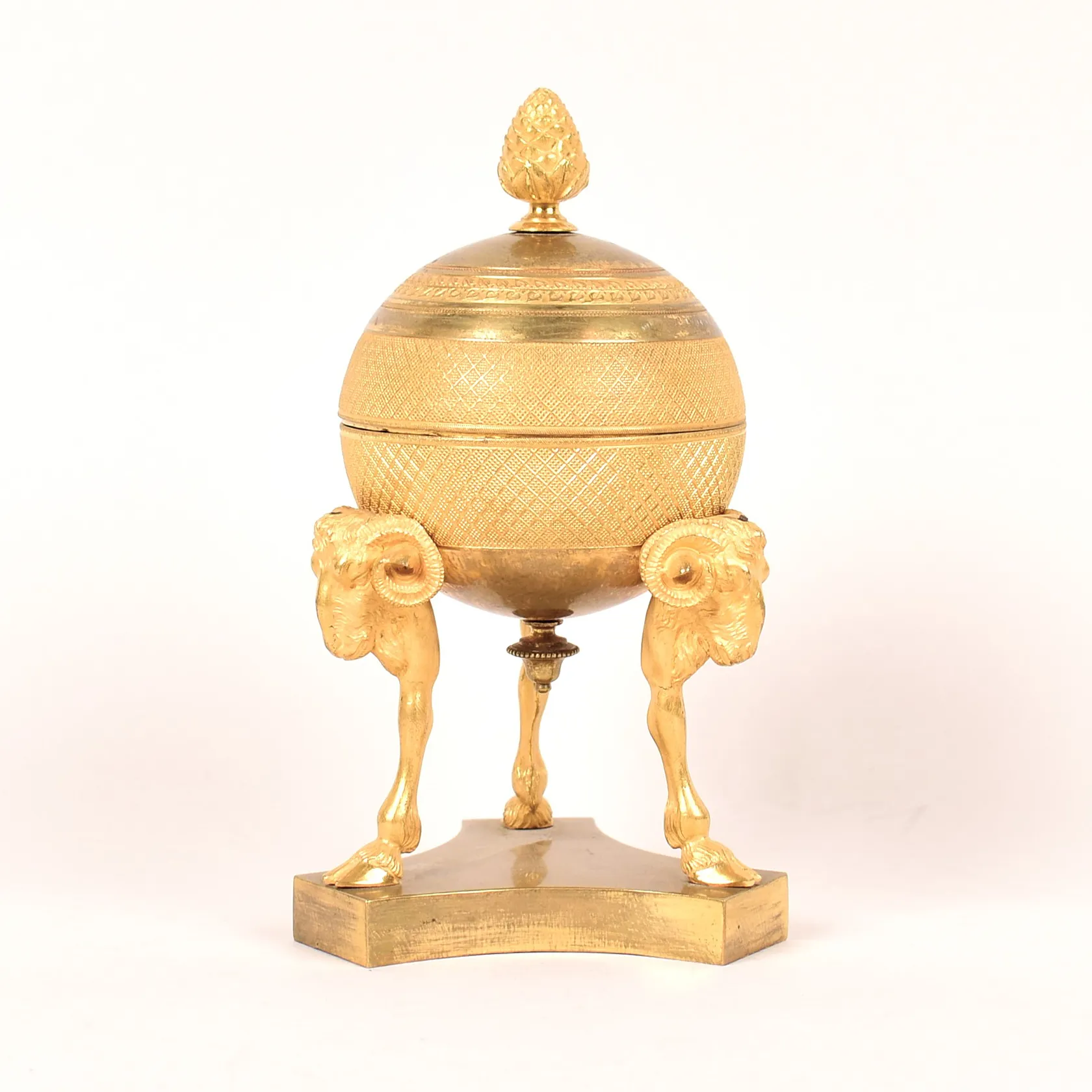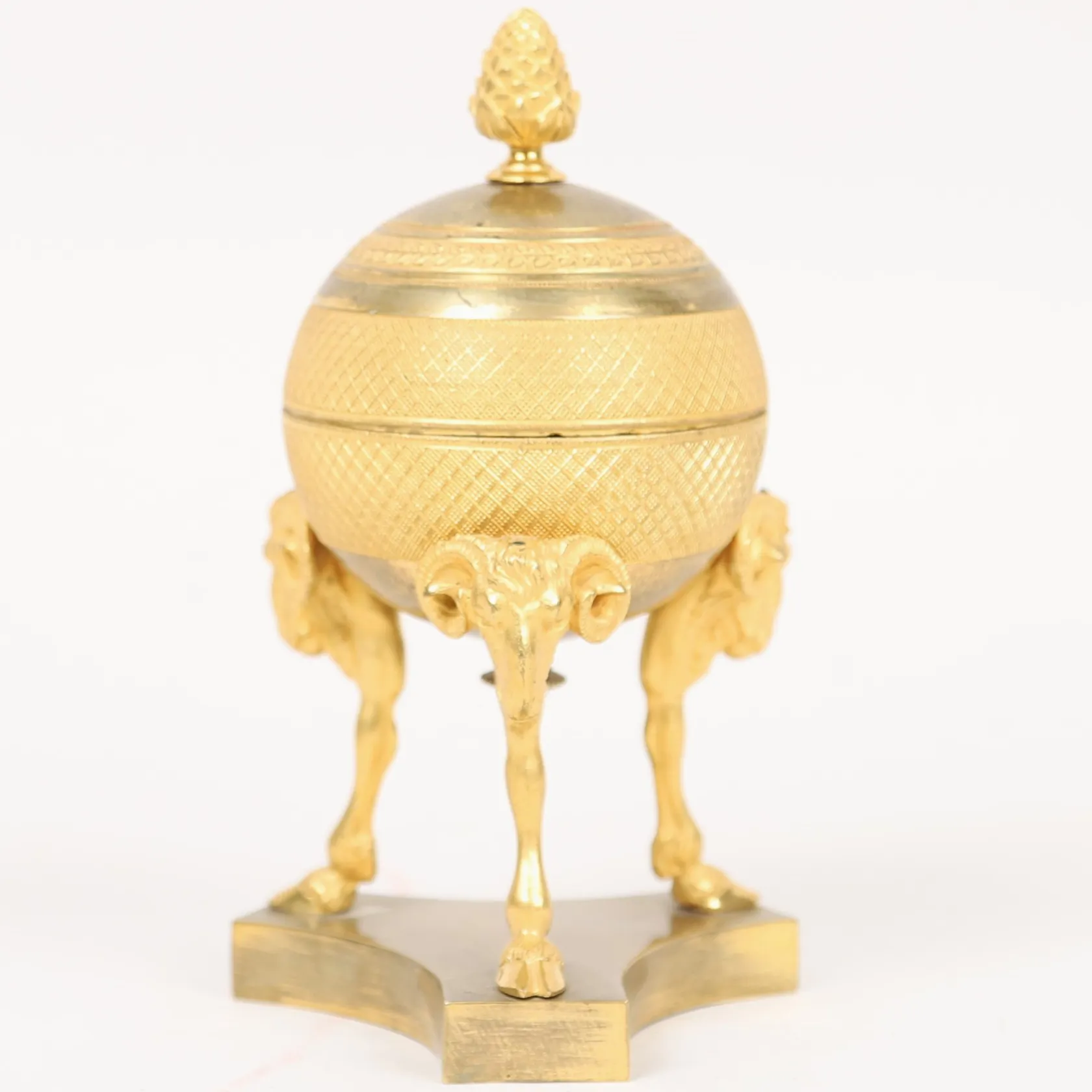 Skrivställ, Empire, brännförgylld brons, klotformad med lock, krönande kotte, vid sidorna vädurshuvuden, på trepassformad fot, höjd ca 17,5cm, insats saknas, kvitto från Stockholms Auktionsverk, proveniens: Peder Thorvangs samling, Båstad