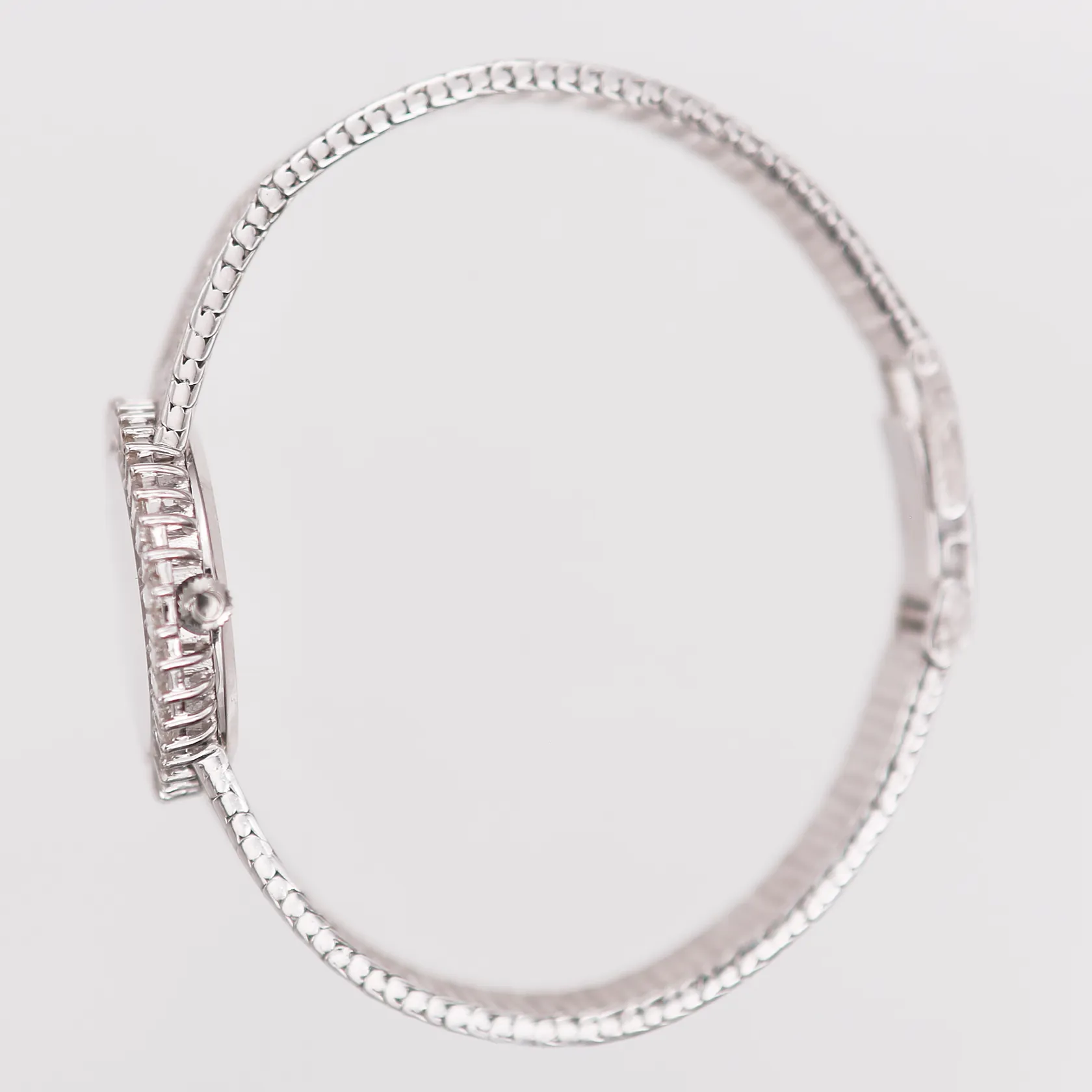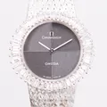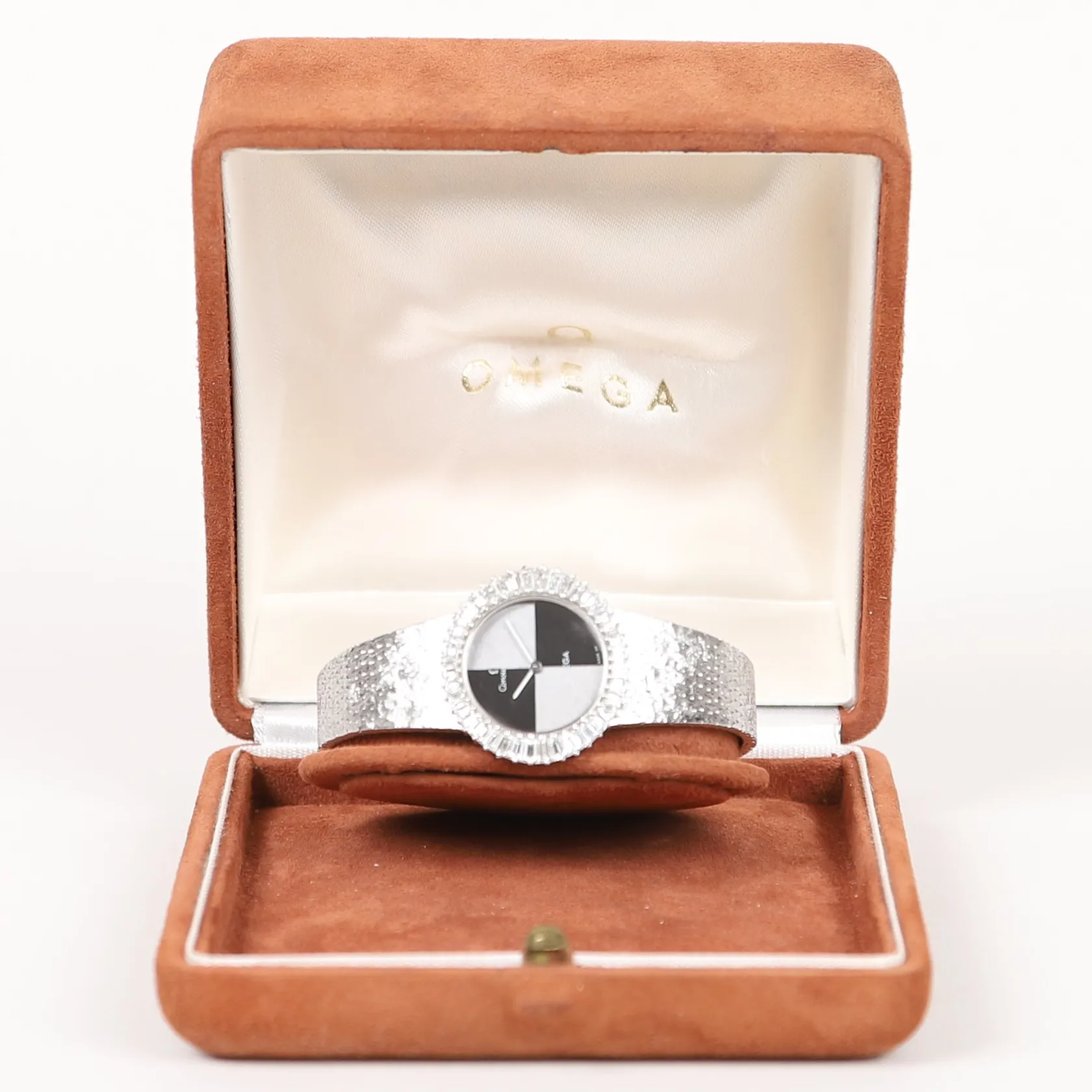 Damur, Omega Constellation, diamantkrans med 42st trapetsslipade diamanter, totalt ca 3,20ct, kvalitet ca TW(F-G)/VVS-VS, urtavla i massivt vitguld (OM swiss OM) manuell, safirglas, integrerad originallänk, längd 18cm, mått 27,5 x 24 mm, 1970-tal, originalbox, armlänk med mindre brott, svenska importstämplar, 18K vitguld, bruttovikt 68gram Vikt: 68 g.